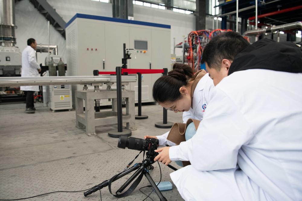 1月14日,在位于安徽省合肥市的聚变堆主机关键系统综合研究设施(CRAFT)园区内,科研人员在巡看强流直线等离子体装置“赤霄”的运行状态。新华社记者 张端 摄
