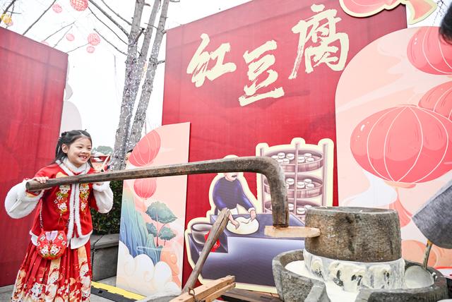 1月16日,一名小女孩在2025年川渝新春年货文化节上体验红豆腐制作。新华社记者 王全超 摄