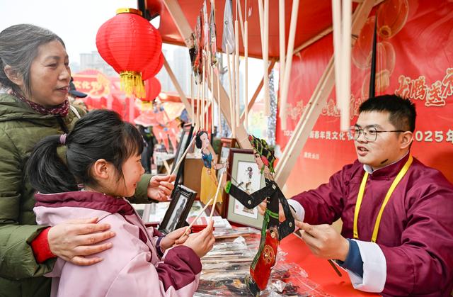 1月16日,游客在2025年川渝新春年货文化节上体验皮影戏。新华社记者 王全超 摄