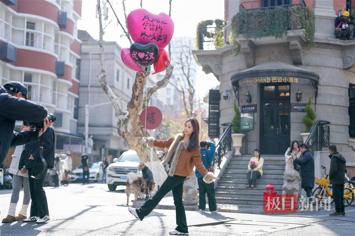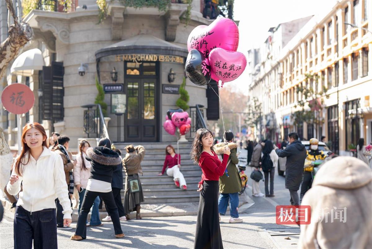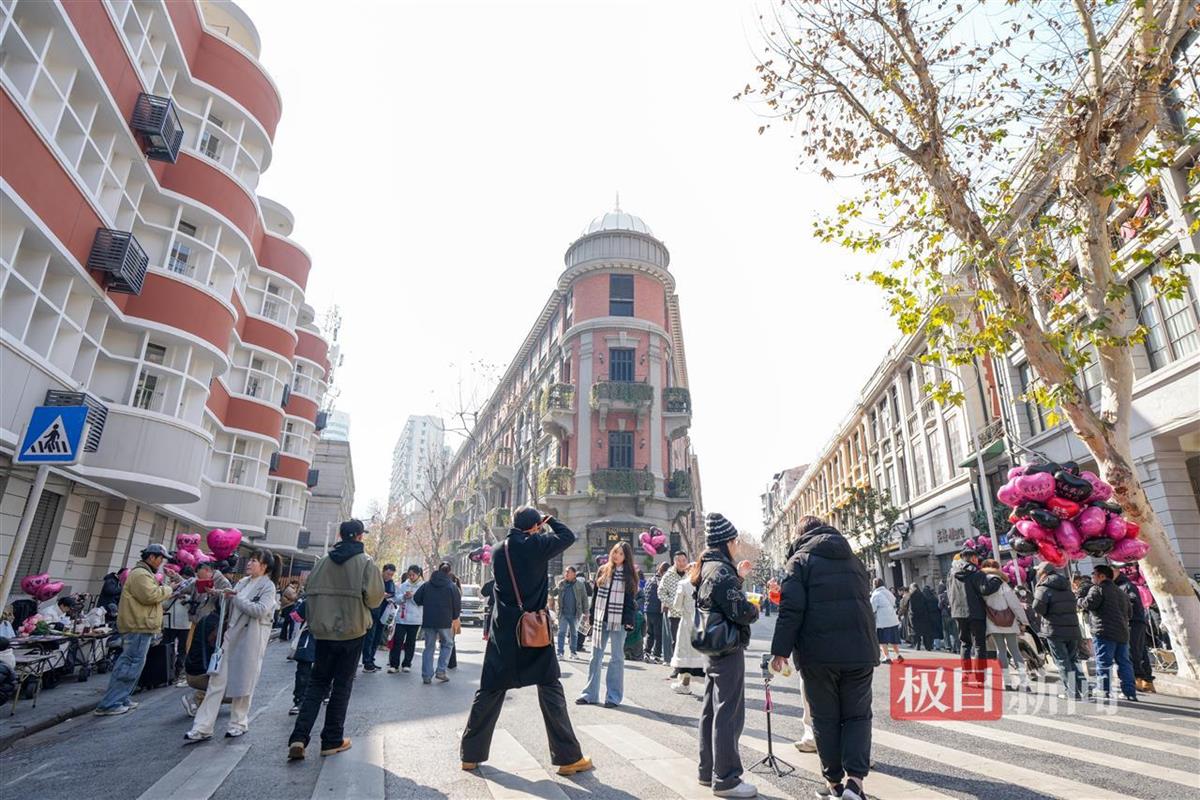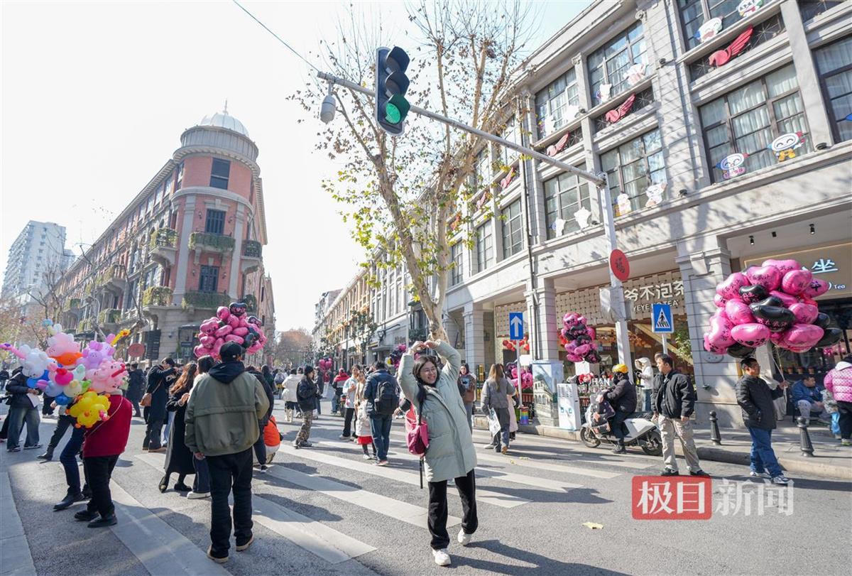 1月16日,暖阳高照,武汉当天最高温达13℃。极目新闻记者在汉口鄱阳街看到,网红打卡点巴公房子前面,前来拍照打卡的游客络绎不绝,大家争相与这座重新翻修的百年建筑合影留念。