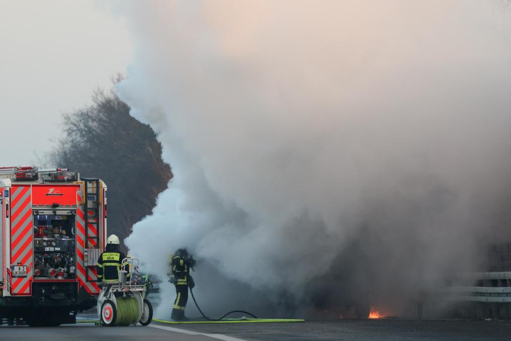 1月19日,在德国科隆-波恩机场附近的一处高速公路上,消防人员对一辆起火的汽车灭火。新华社/路透