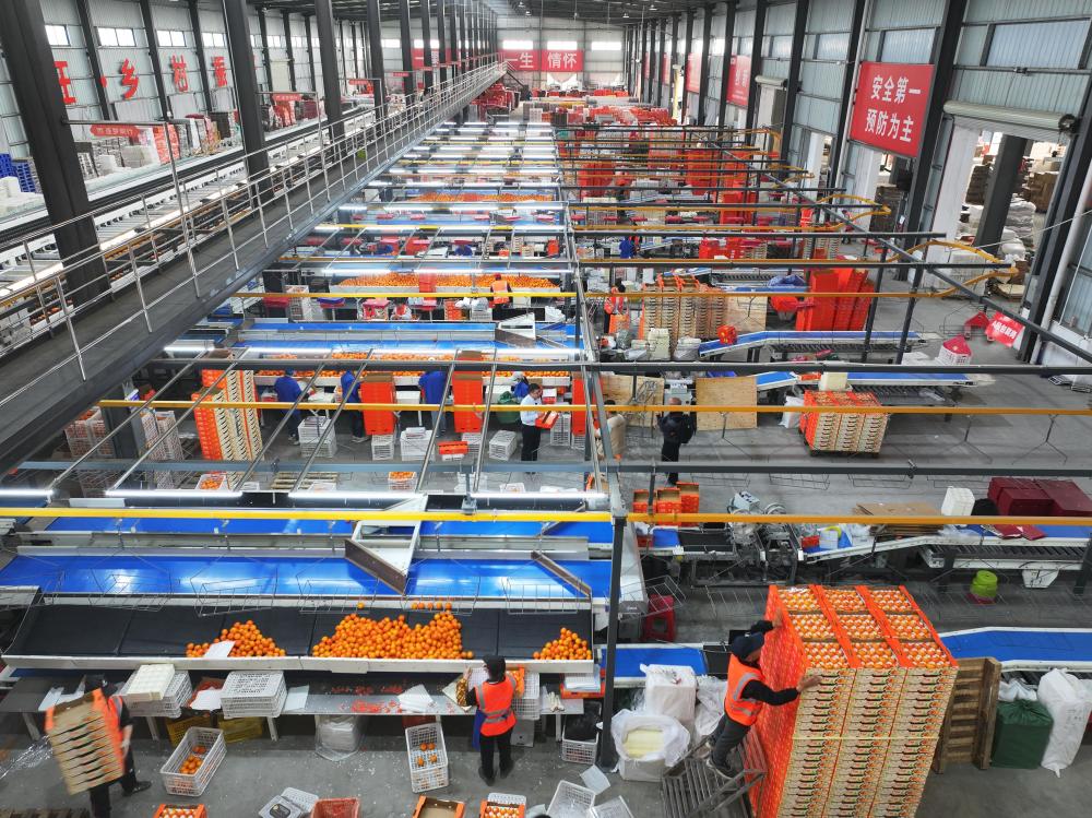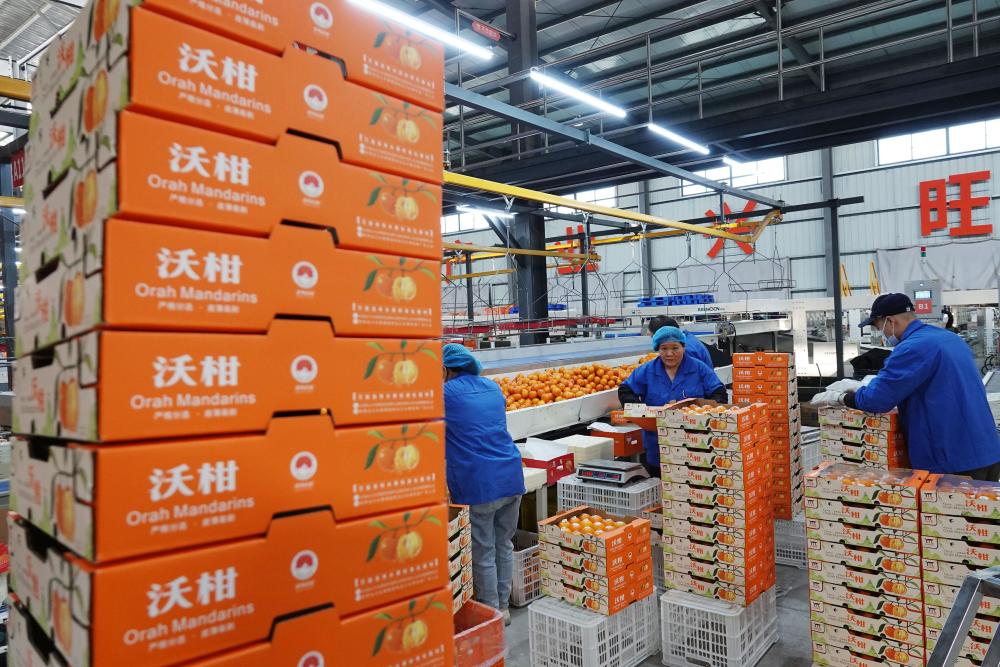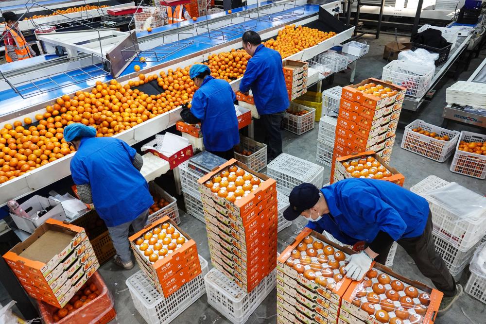 ↑2025年1月19日,在广西南宁市武鸣区鸣鸣果园数字化分选中心,工人在包装分级后的沃柑。CICPHOTO/喻湘泉 摄