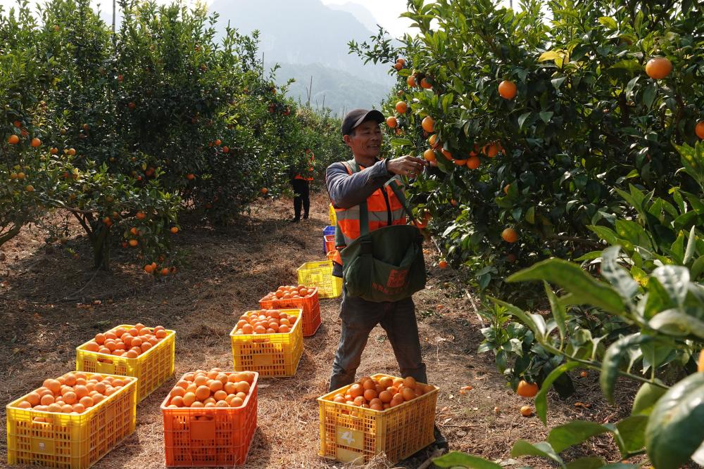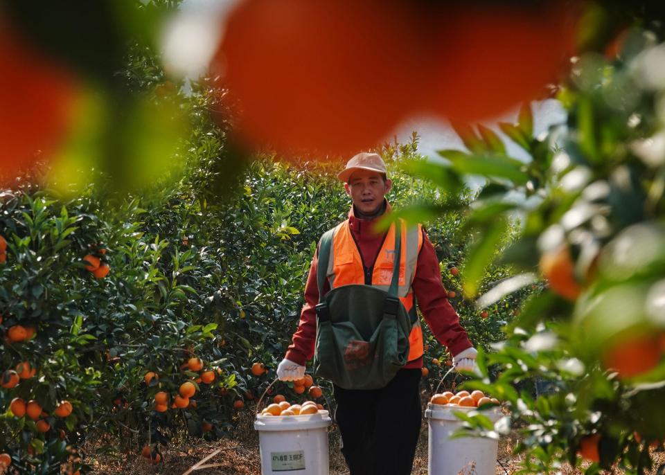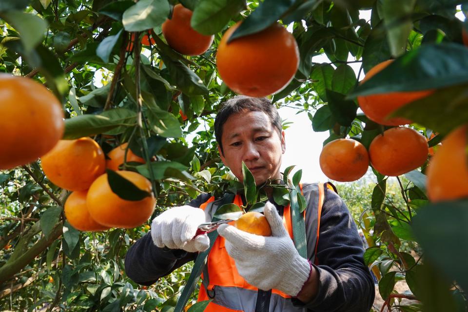 ↑2025年1月19日,在广西南宁市武鸣区石梁村鸣鸣果园标准化种植基地,工人在采摘沃柑。CICPHOTO/喻湘泉 摄
