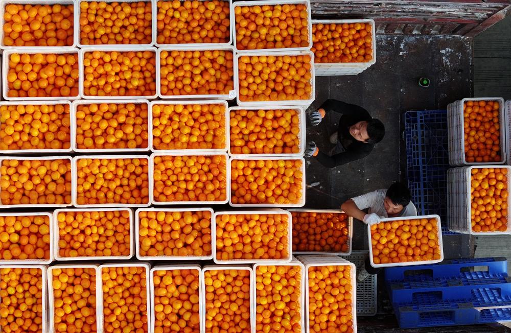 ↑2025年1月19日,在广西南宁市武鸣区鸣鸣果园数字化分选中心,工人将分级后的沃柑装车,准备发往全国果蔬市场。CICPHOTO/喻湘泉 摄