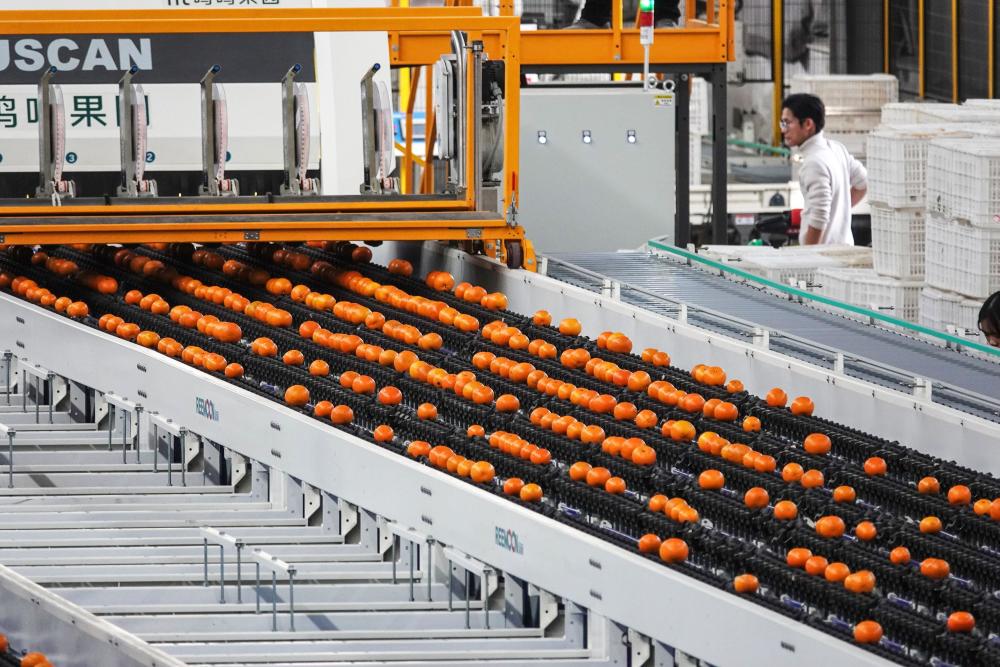 ↑2025年1月19日,在广西南宁市武鸣区鸣鸣果园数字化分选中心,工人用智能化分选设备在对沃柑进行分级作业。CICPHOTO/喻湘泉 摄