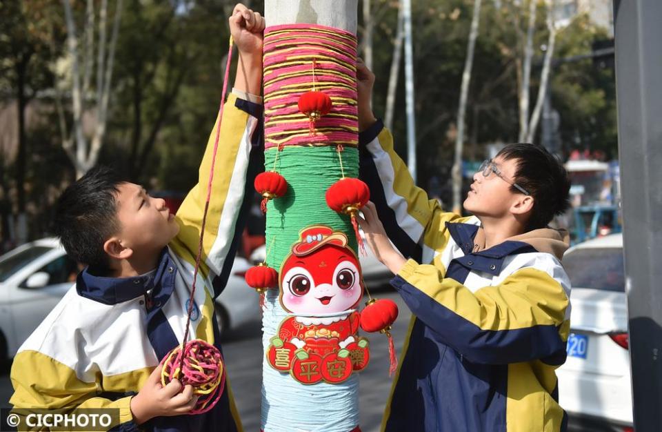 ↑2025年1月22日,学生在安徽省合肥市庐阳区大杨镇五里拐社区参加给树木“穿毛衣”的活动。CICPHOTO/葛传红 摄