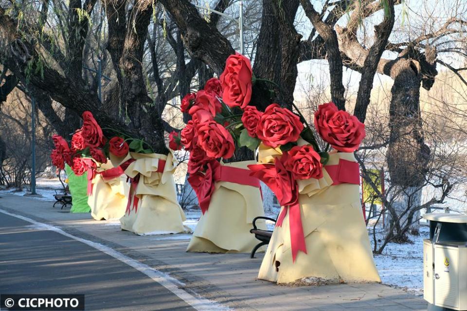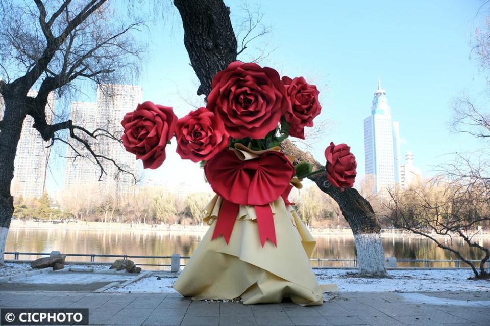 ↑2024年12月3日在辽宁省沈阳市和平区南湖公园拍摄的被仿真红色玫瑰花装饰如巨型花束的行道树。CICPHOTO/黄金崑 摄