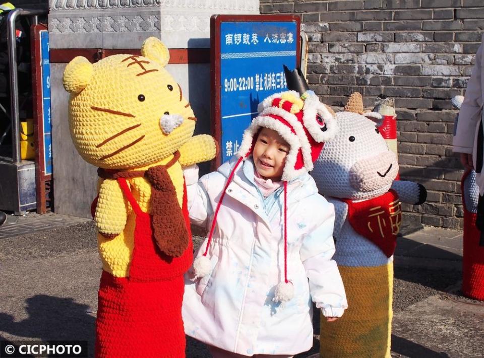 ↑2025年1月20日,小朋友在北京南锣鼓巷好奇地看着“穿毛衣”的隔离桩。CICPHOTO/杜建坡 摄