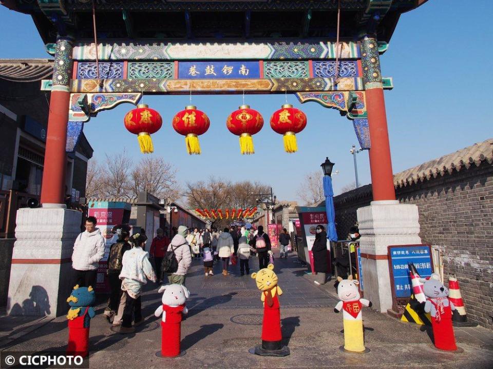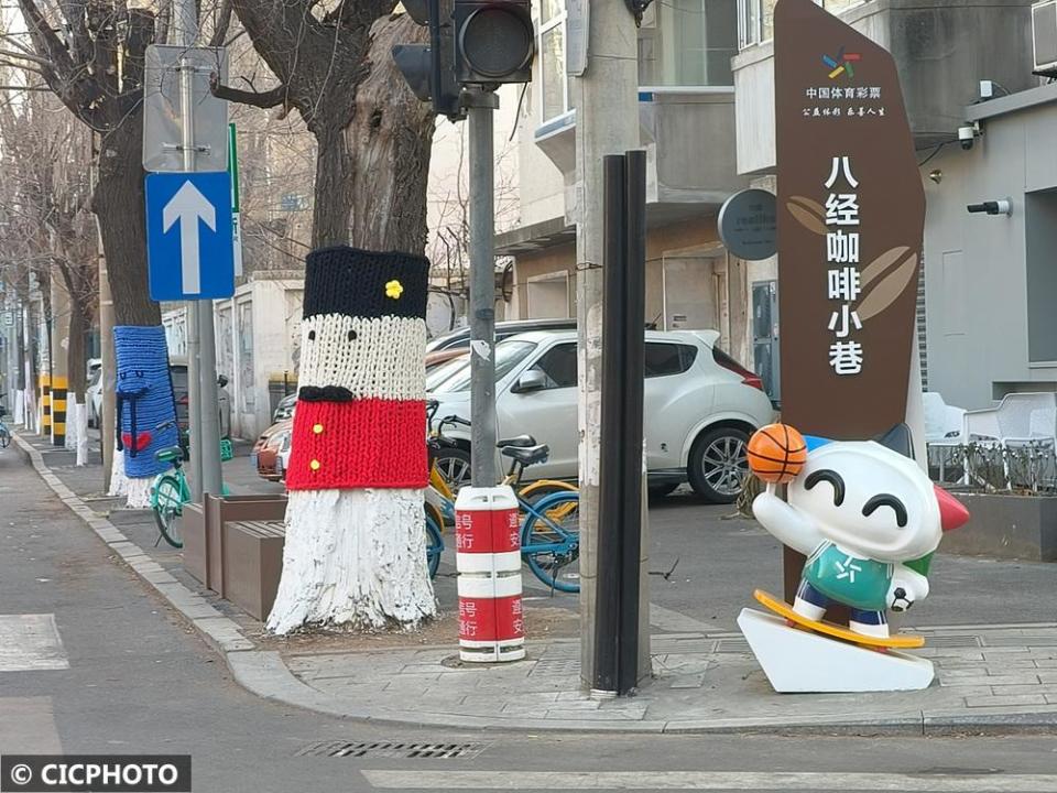 ↑2025年1月20日在北京南锣鼓巷拍摄的“穿毛衣”的隔离桩。CICPHOTO/杜建坡 摄