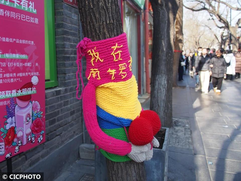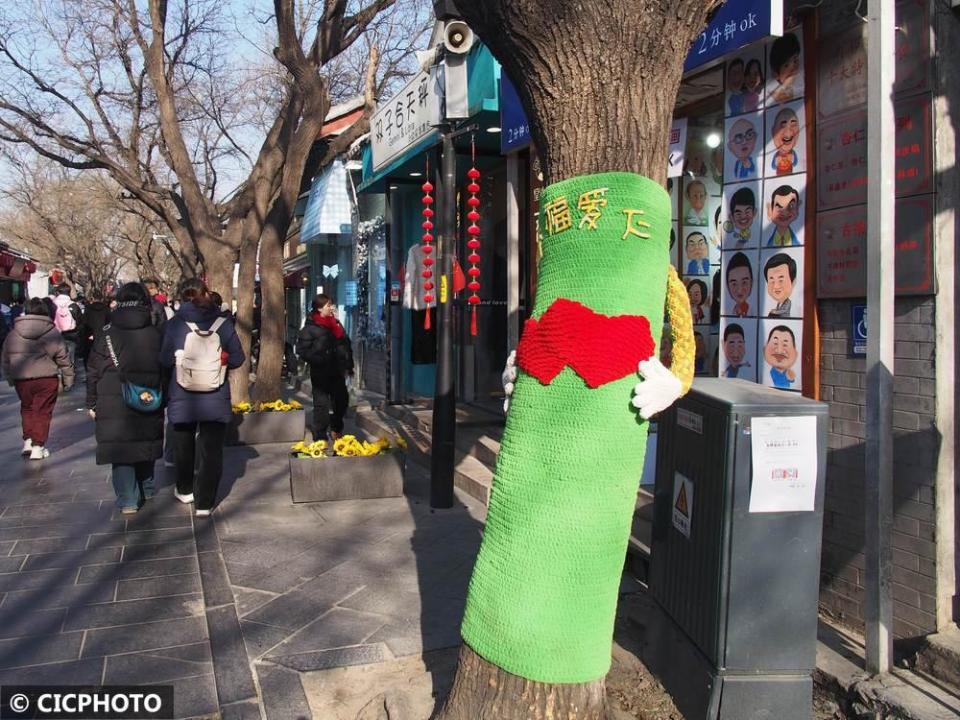 ↑2025年1月20日在北京南锣鼓巷拍摄的“穿毛衣”的行道树。CICPHOTO/杜建坡 摄