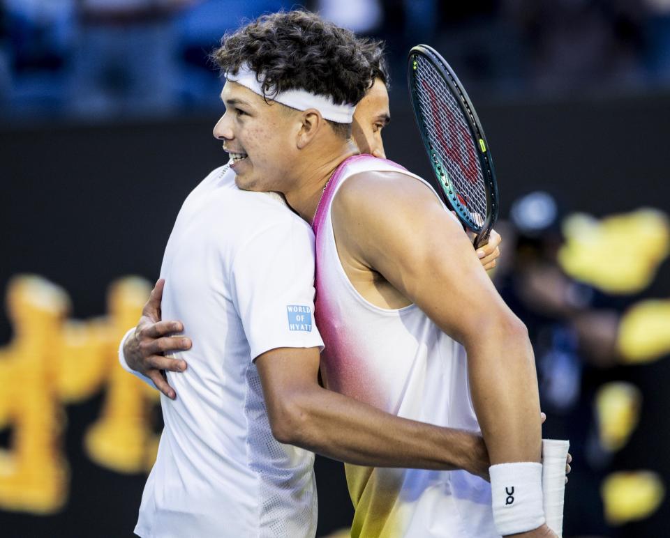 1月22日,谢尔顿(右)与索内戈赛后拥抱。新华社发(胡泾辰摄)