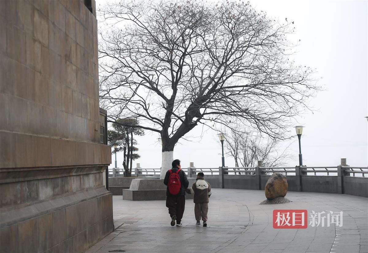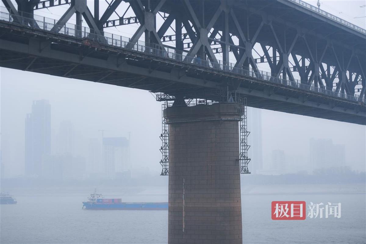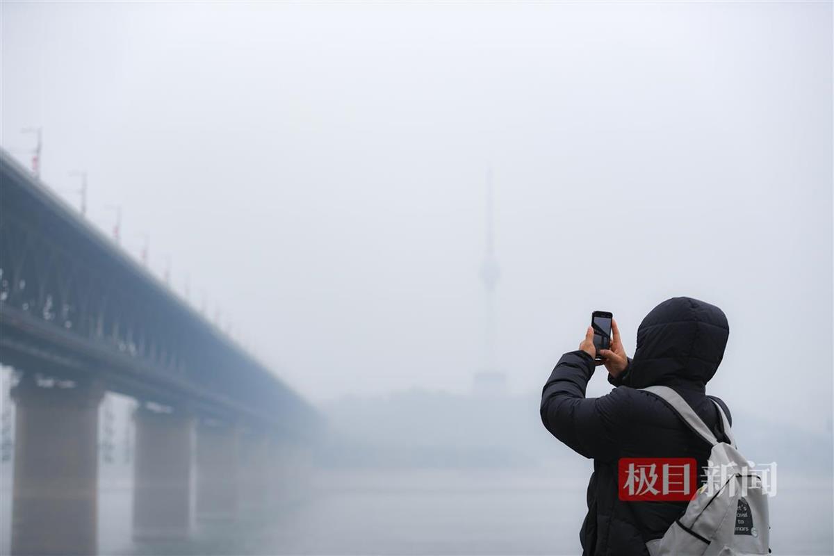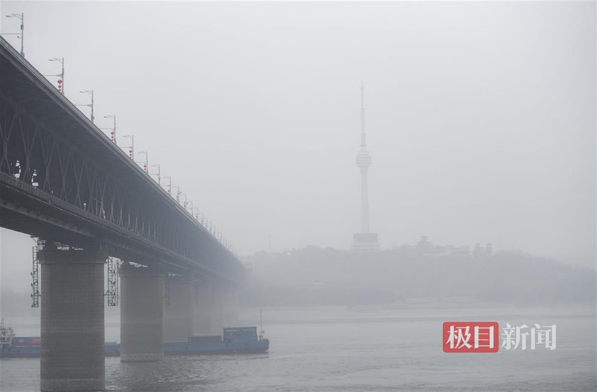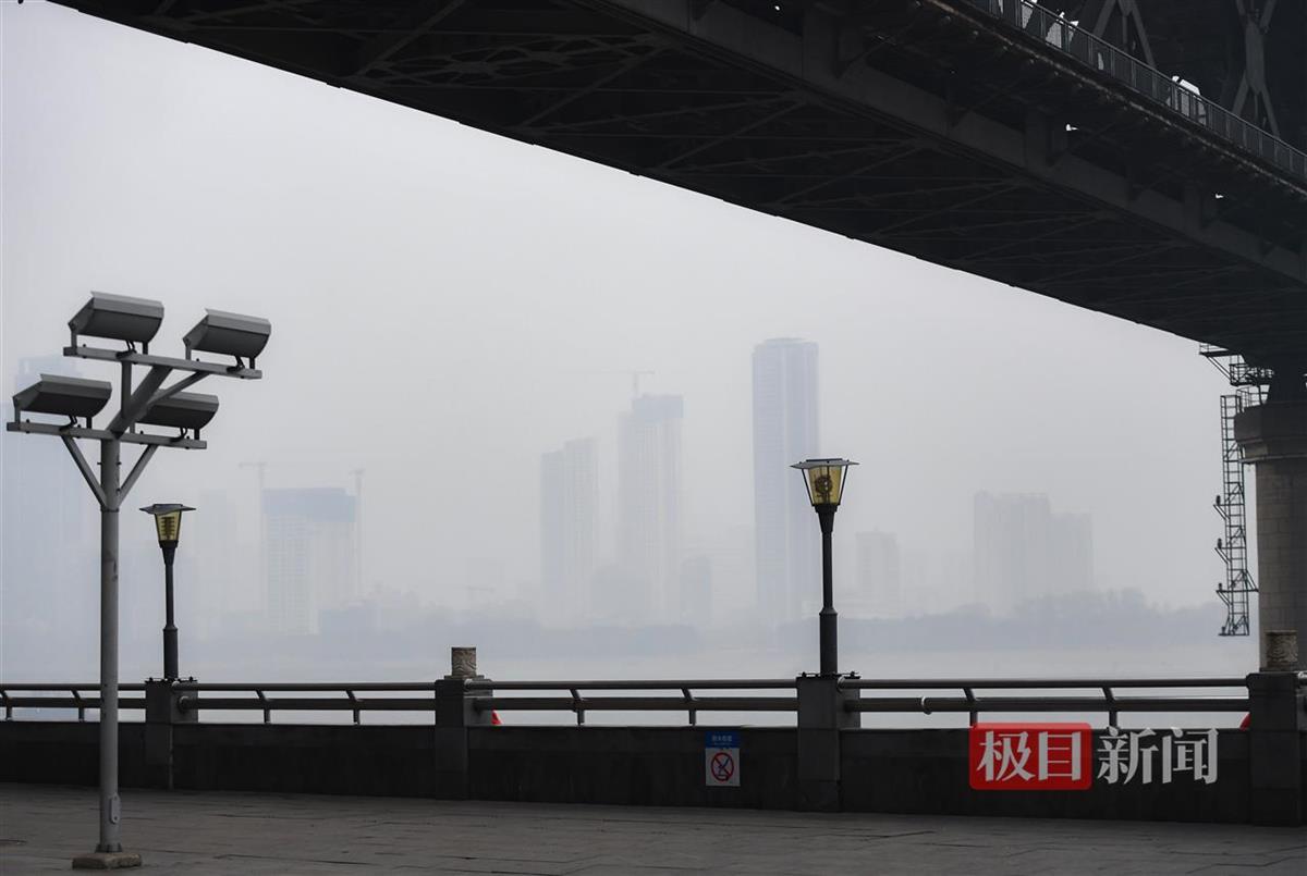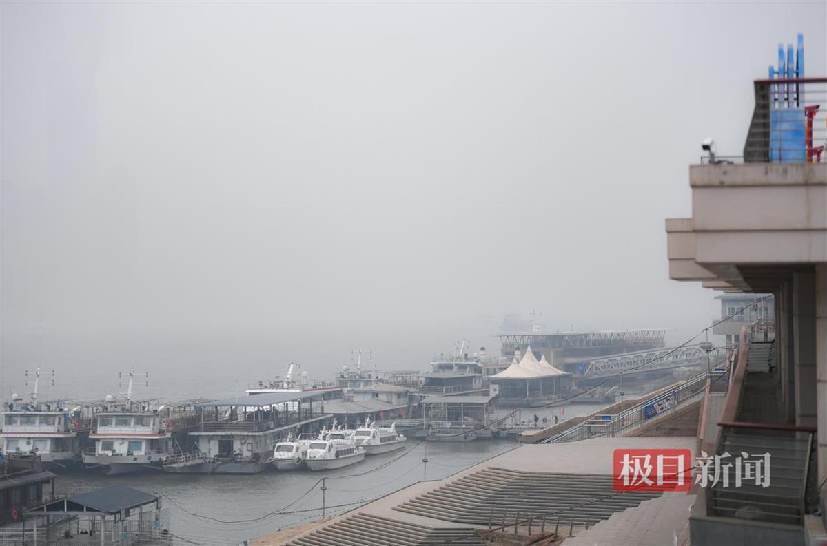 记者在武昌汉阳门远眺汉口方向,平日里清晰可见的高楼大厦此刻在雾霾中若隐若现,远处江面上的轮船也隐入雾中,难以一眼望清。