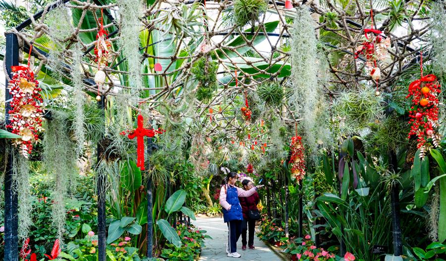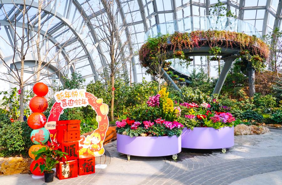 “灵蛇献瑞”展区以形状和色彩多样的热带兰花及年宵花卉为特色,设计了5组年宵园艺景点,总面积达500平方米。蝴蝶兰翩翩起舞,寓意幸福飞来;大花蕙兰花朵华丽,象征富贵好运……在这里,年宵花的丰富多彩营造出浓厚的节日氛围。