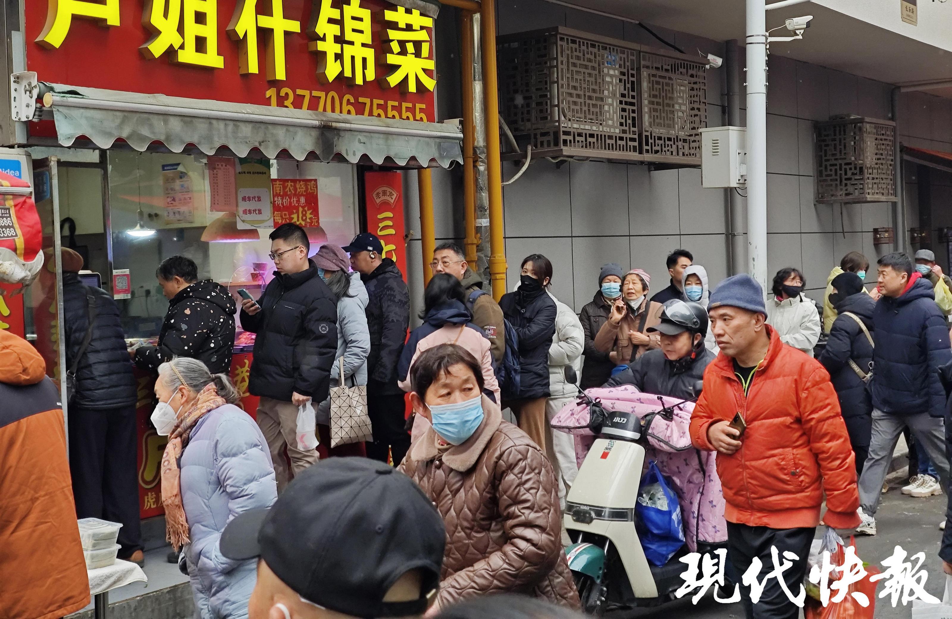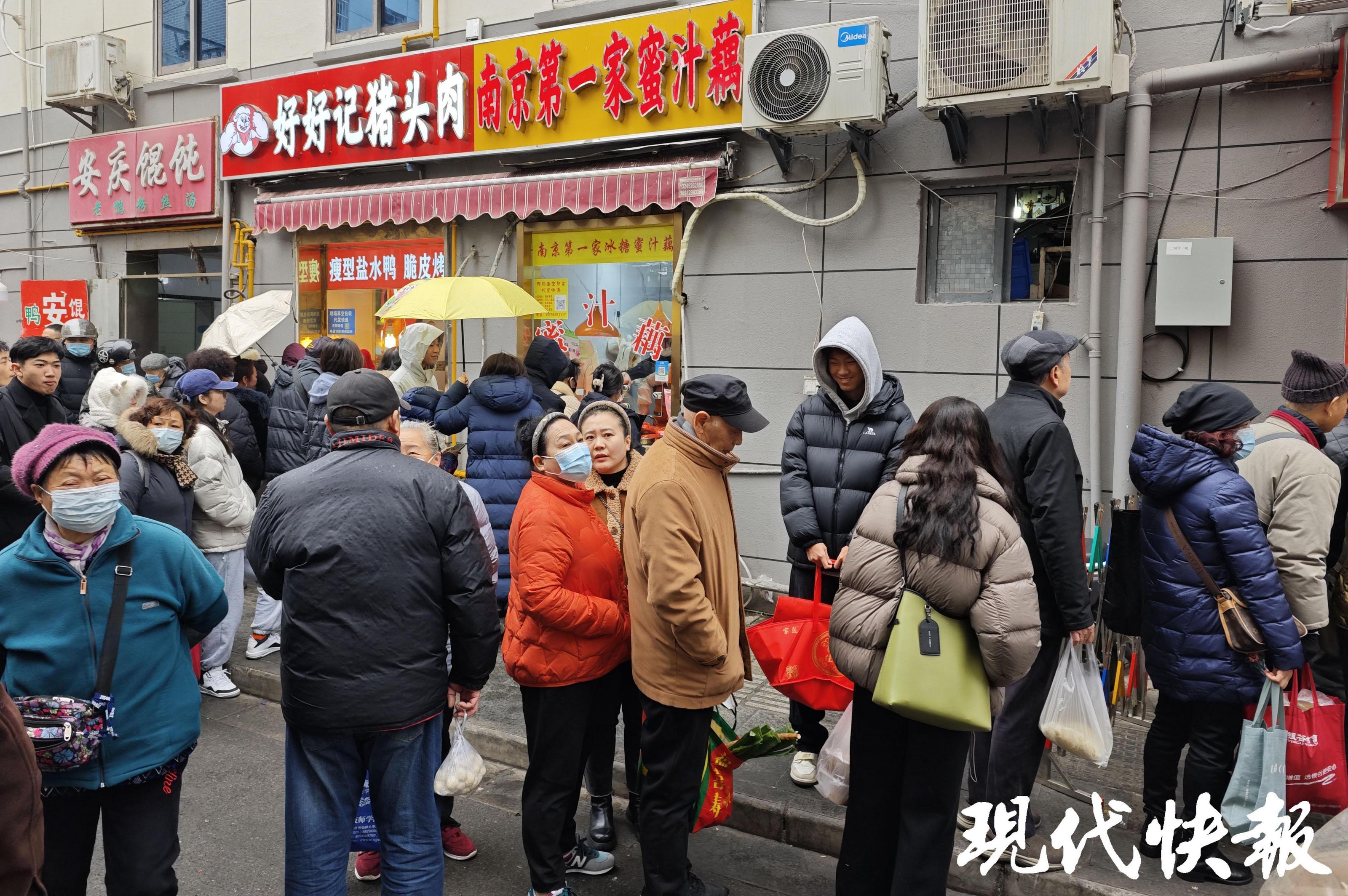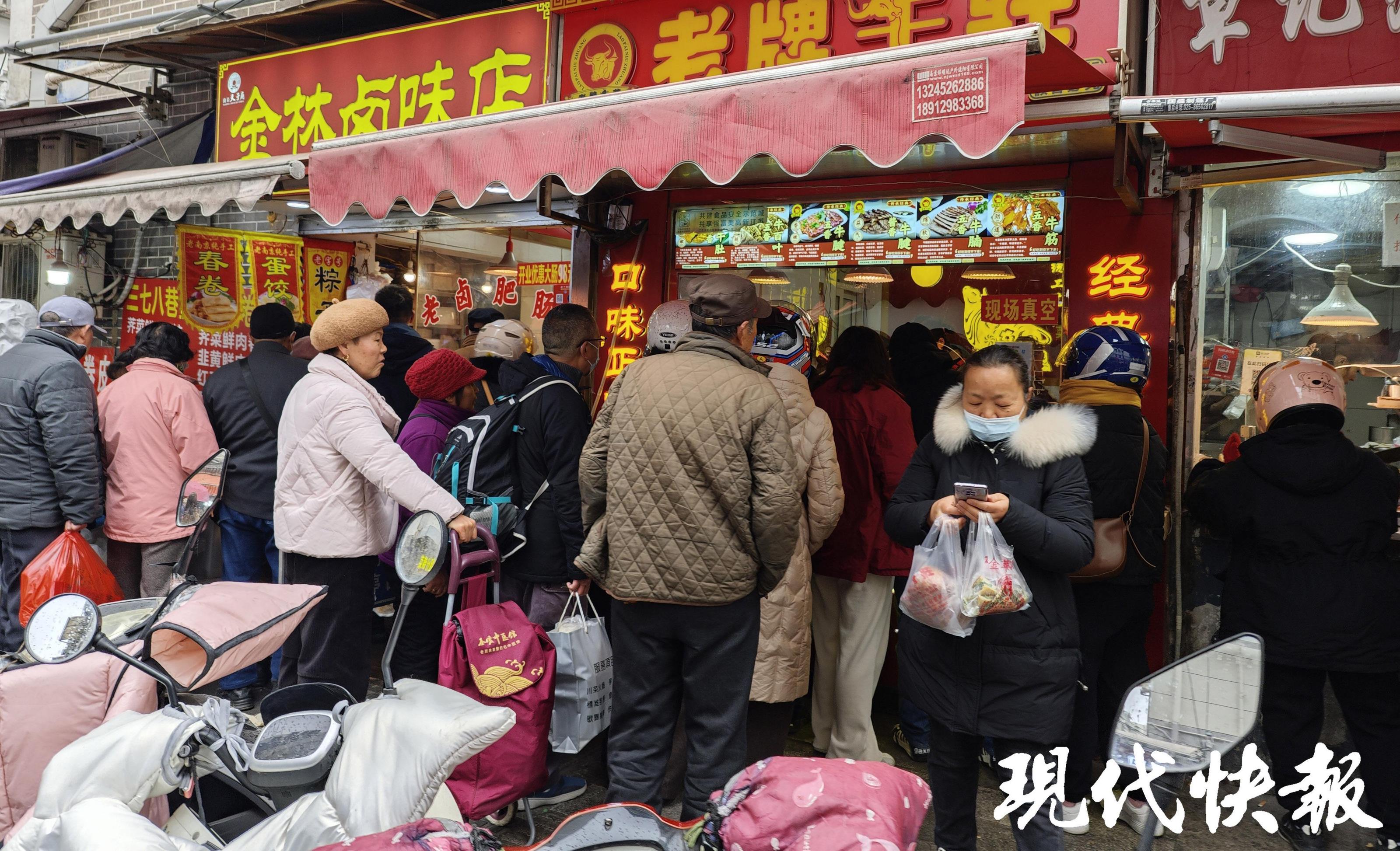 随着2025年春节的日益临近,南京市民采购年菜忙。现代快报记者来到被誉为“南京宝藏美食街”的网红打卡地:三七八巷。不论是章记瘦型鸭子店,还是卢姐什锦菜、无声蛋饺和沈记熏鱼,没有一家是不排队的,甚至一眼看不到头。现代快报记者采访发现,有的甚至要排两三个小时。