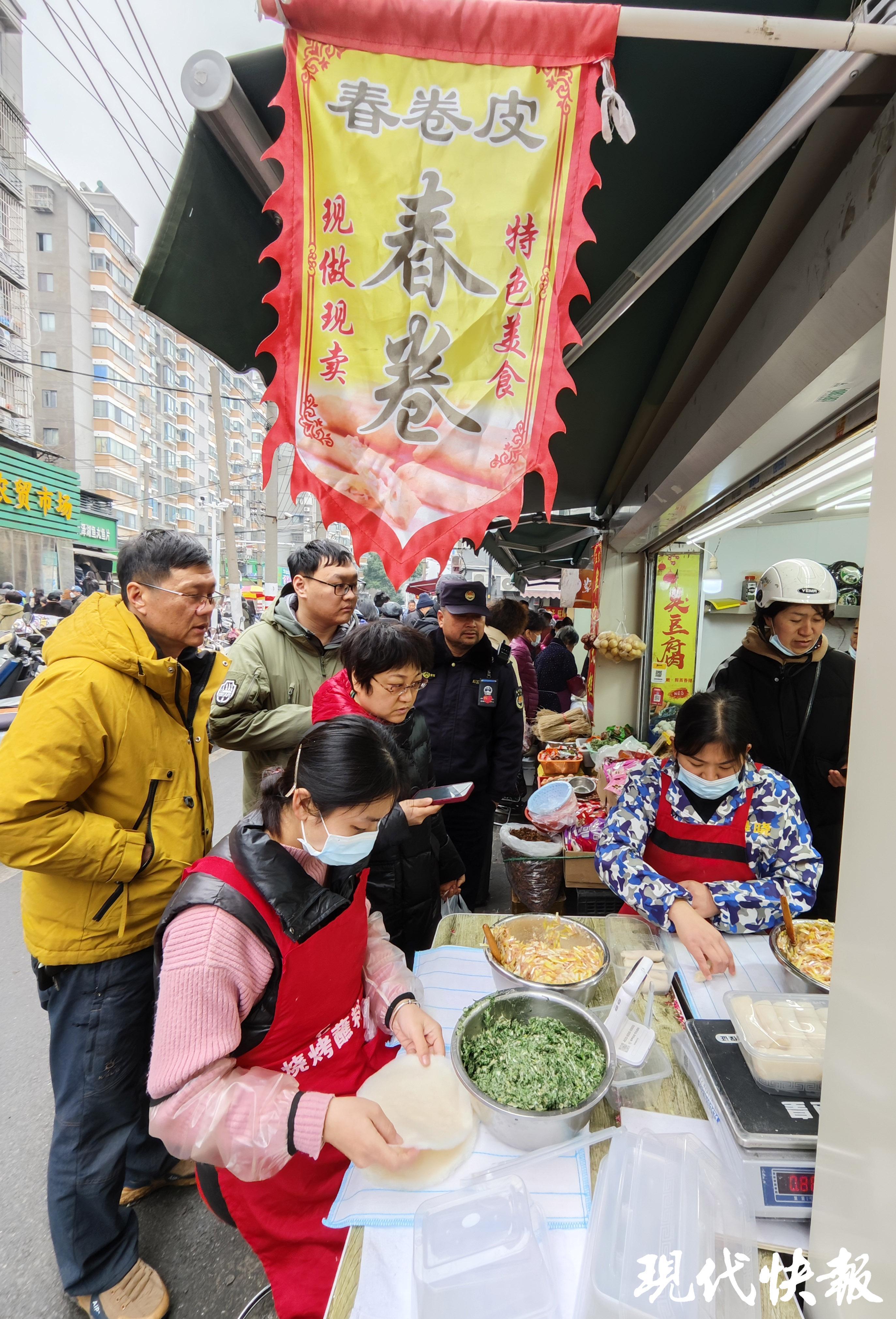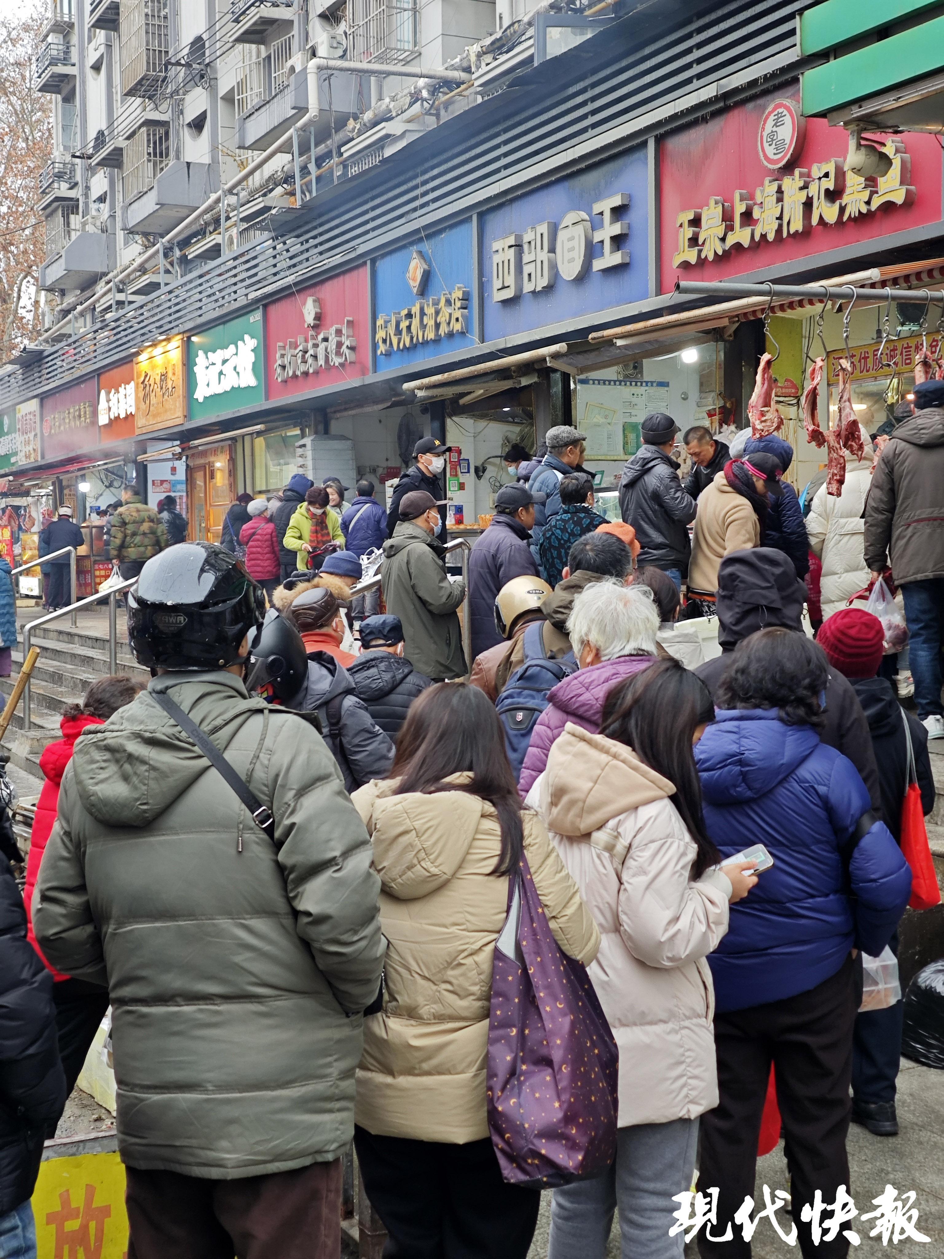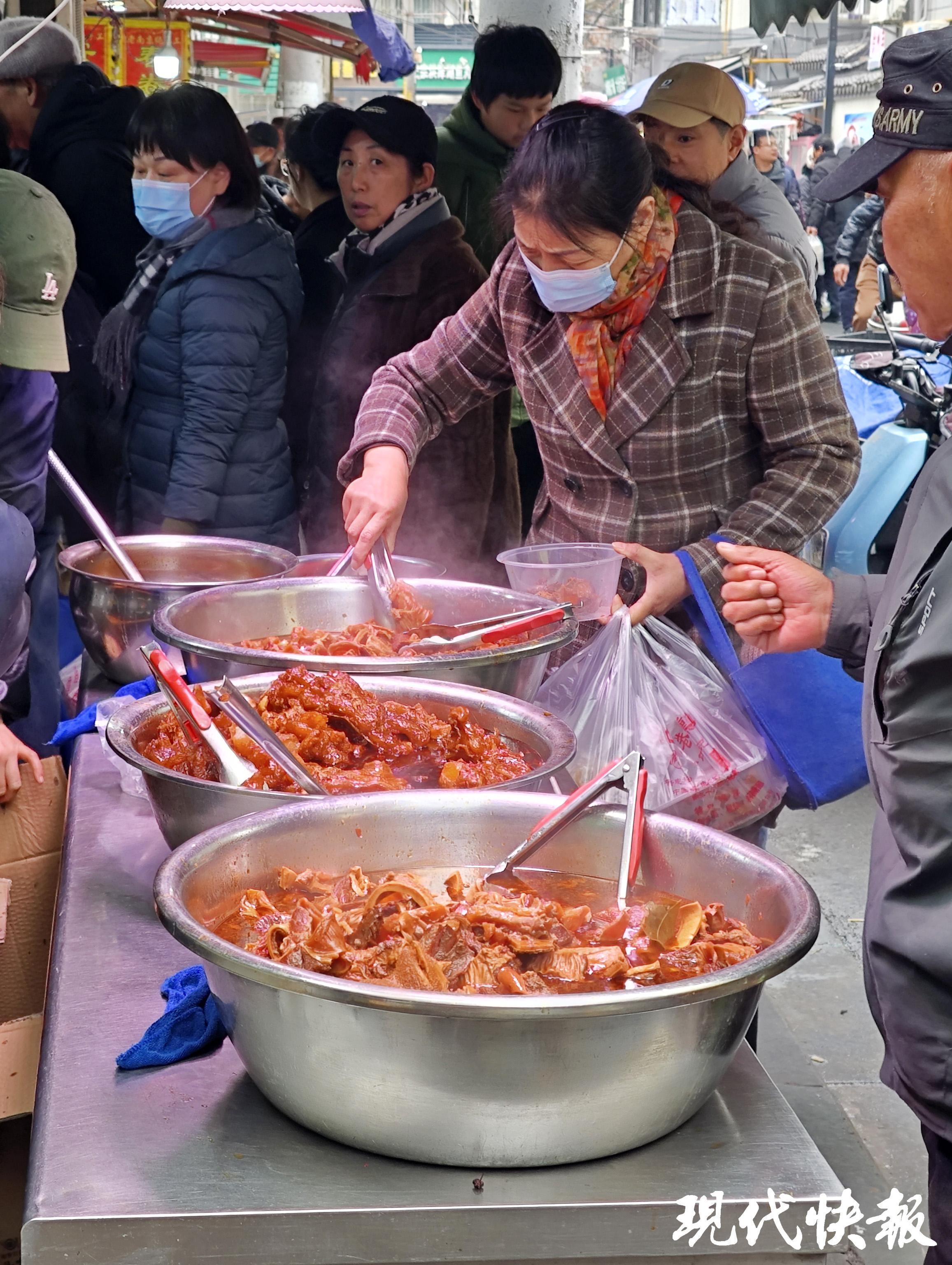 酱牛肉、熏鱼、蜜汁藕、春卷……到处都是排着队等着采购的市民,云片糕、糖芋苗、蒸儿糕、梅花糕……满满的童年记忆,炒货、干果等小吃也应有尽有。年味在这一刻具象化了——耳边是人声鼎沸,市井长巷到处升腾着烟火气。