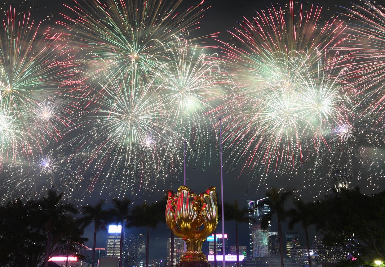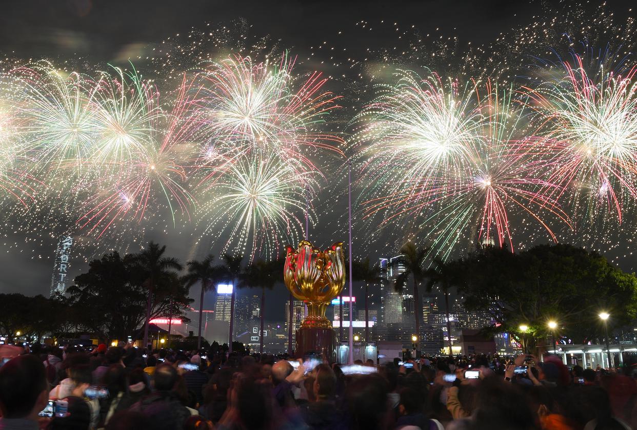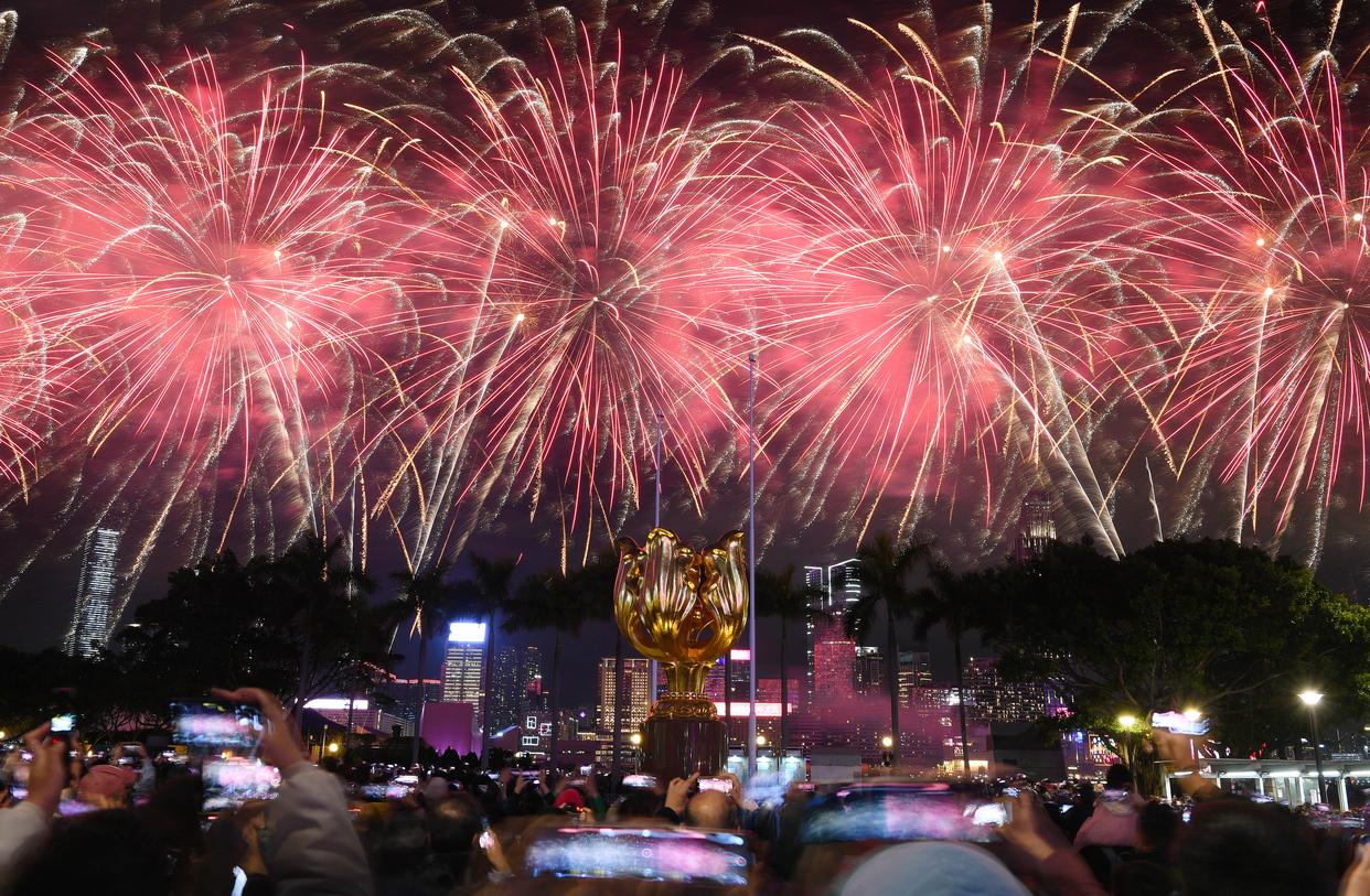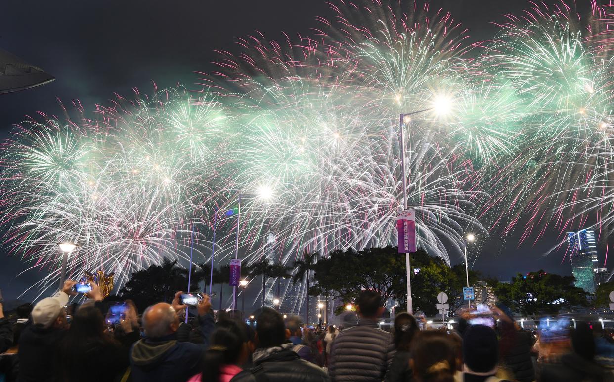 1月30日,烟花在香港维多利亚港上空绽放,欢庆新春佳节。