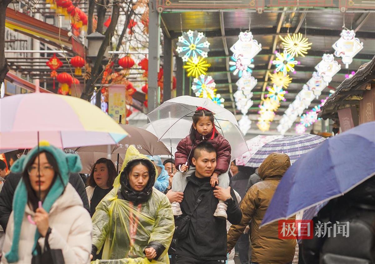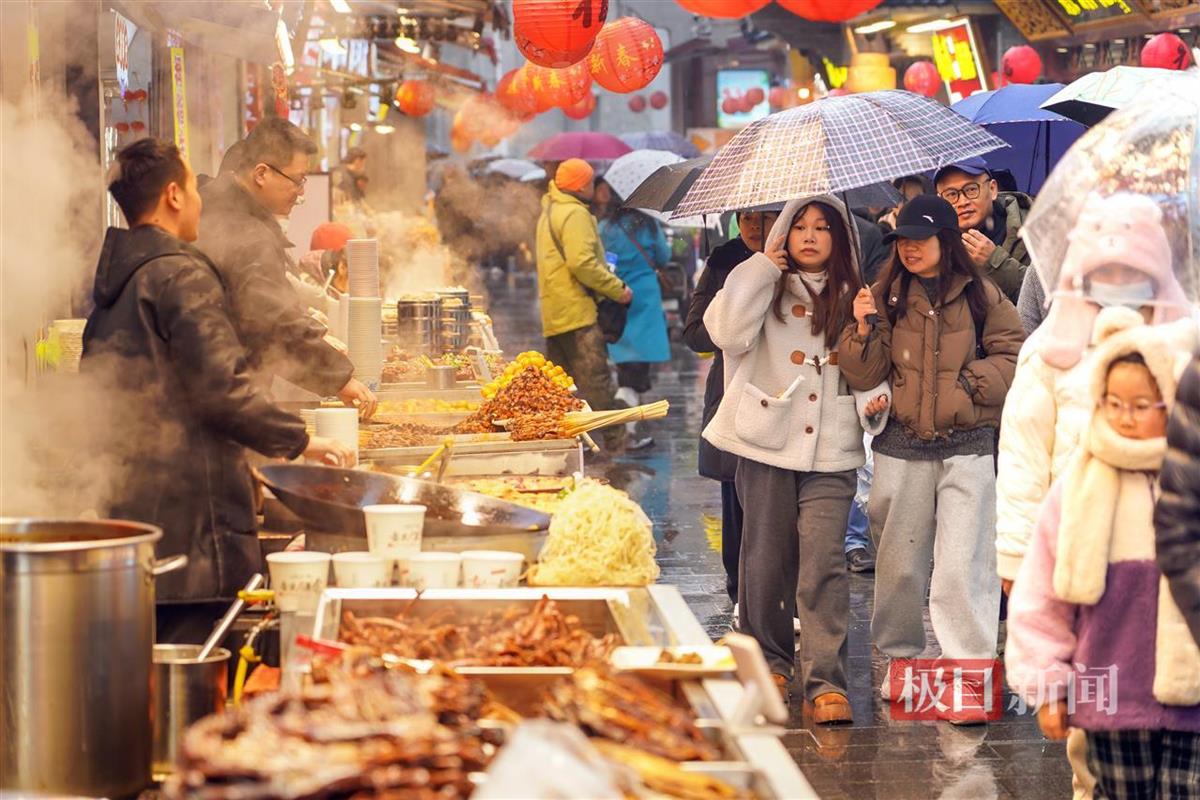 1月31日正月初三,细雨织就的薄纱笼住江城。雨丝裹着料峭,却未能浇熄户部巷里翻滚的春潮。作为央视春晚分会场之一的武汉,其著名的美食街户部巷吸引了大批天南海北的游客,热闹的景象使得年味愈发醇厚。