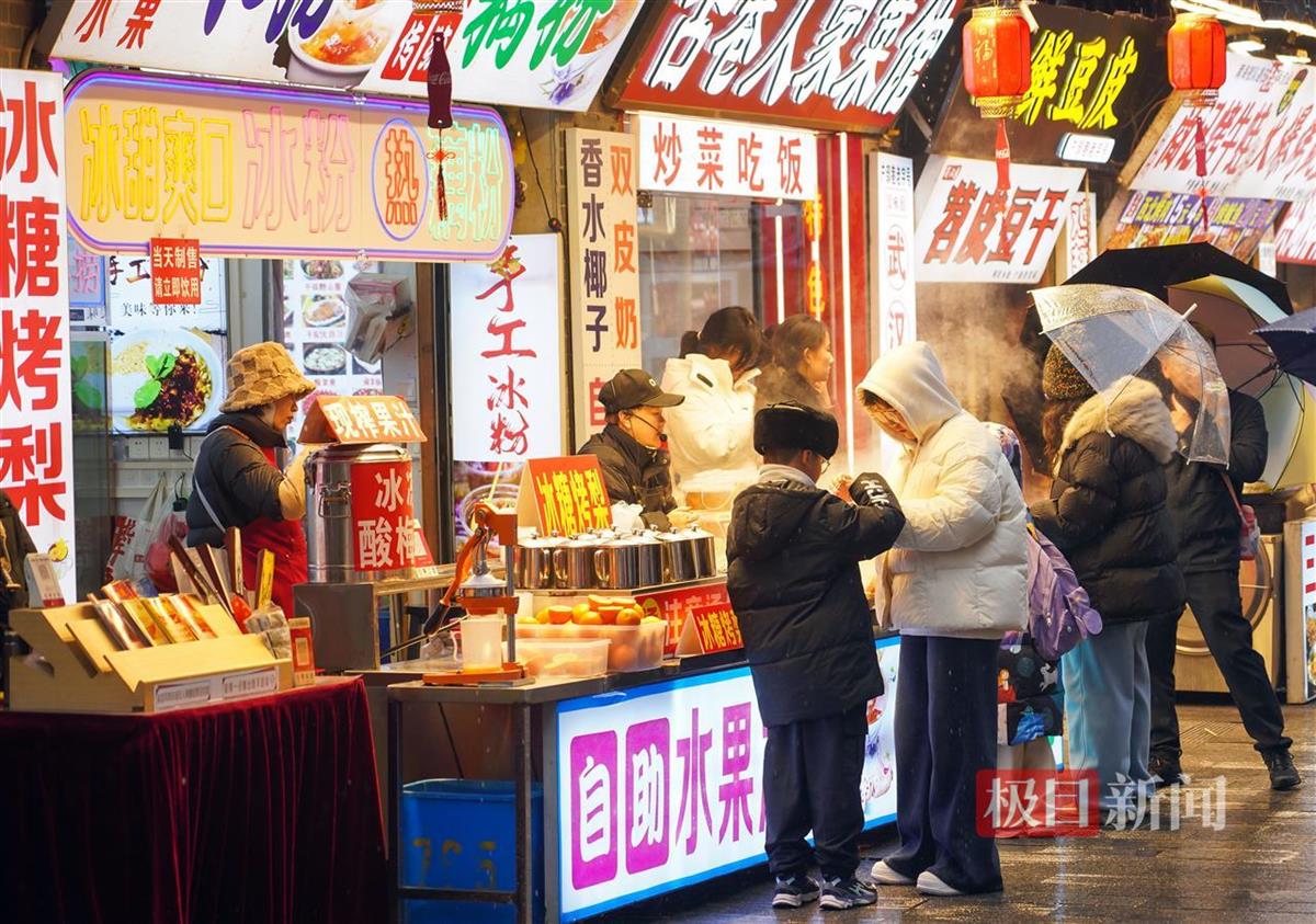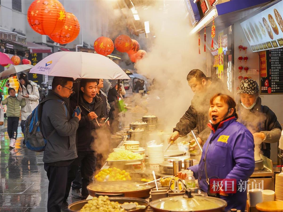 蒸笼叠起的热气在古巷上空盘桓,铁板上的三鲜豆皮滋滋作响,油锅里翻腾的金黄面窝裹着葱香,藕汤的醇厚蒸汽混着游客的欢语直往人怀里扑。天南海北的方言在伞花下碰撞,小吃摊、商店门前排起了长队,大家都来体验老武汉过早文化,每一处都充满了新年的热烈与喧嚣。
