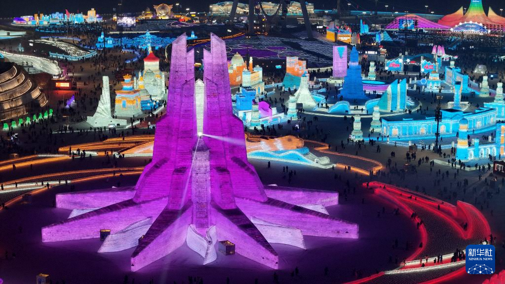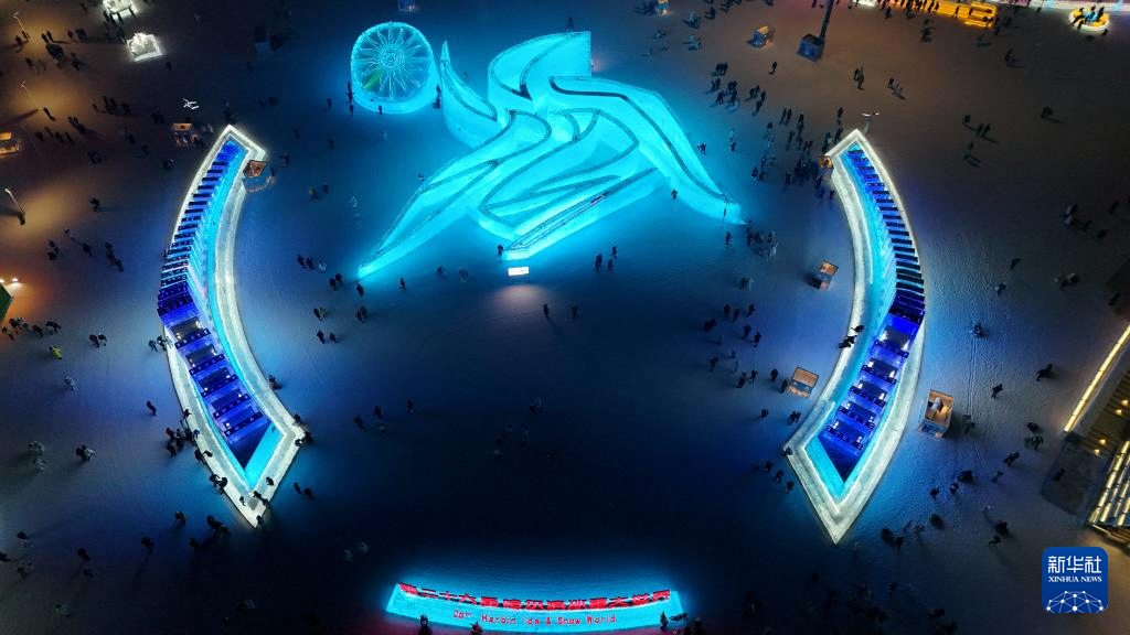这是1月26日拍摄的第二十六届哈尔滨冰雪大世界园区内的第九届亚冬会会徽冰雕,哈尔滨冰雪大世界将作为亚冬会开幕式的分会场(无人机照片)。