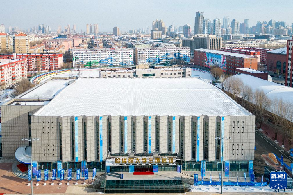 这是1月21日拍摄的哈尔滨体育学院大学生滑冰馆(女子冰球比赛场馆)(无人机照片)。