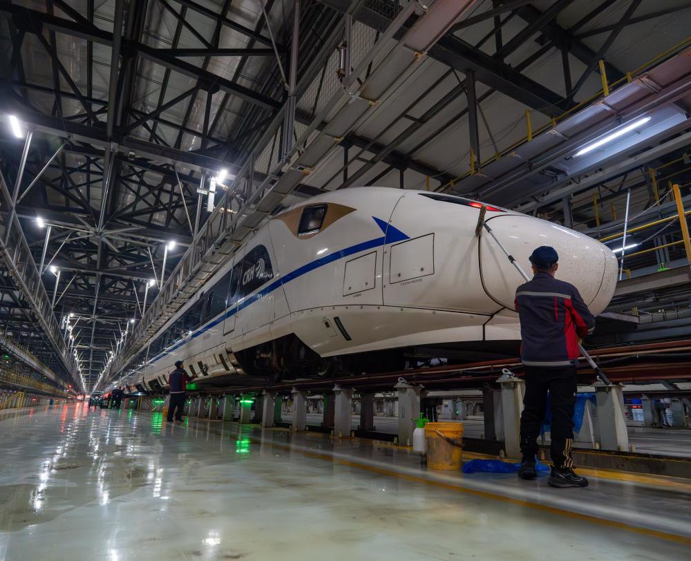 2月6日晚,动车组列车停靠在检测线上等待检修。新华社记者 薛晨 摄