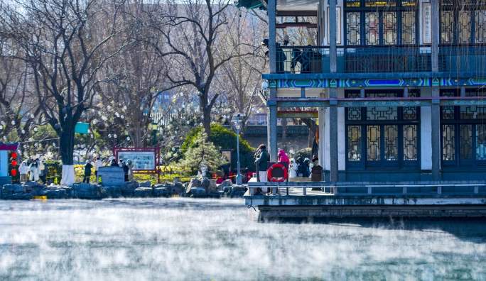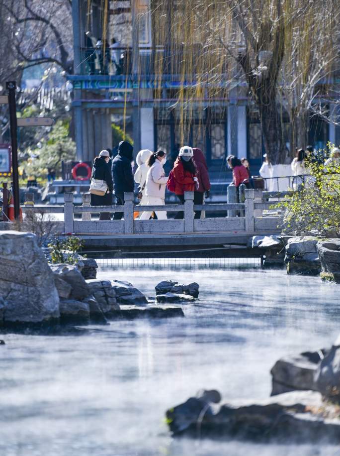 泉水汇聚的五龙潭泉池水面上冒出大片白色水汽,云雾升腾犹如开锅一般壮观,形成“云雾润蒸”的景观。