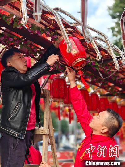 在枫亭的另一处,同为手艺人的陈维雄也在检查他制作的蜈蚣灯,在蜈蚣灯下挂上一个个灯笼。他介绍说,每年枫亭元宵游灯的蜈蚣灯都需要重新制作,用的材料是农历9月份过后的毛竹,经过火熏、烤等步骤,制作时间需要一个多月。