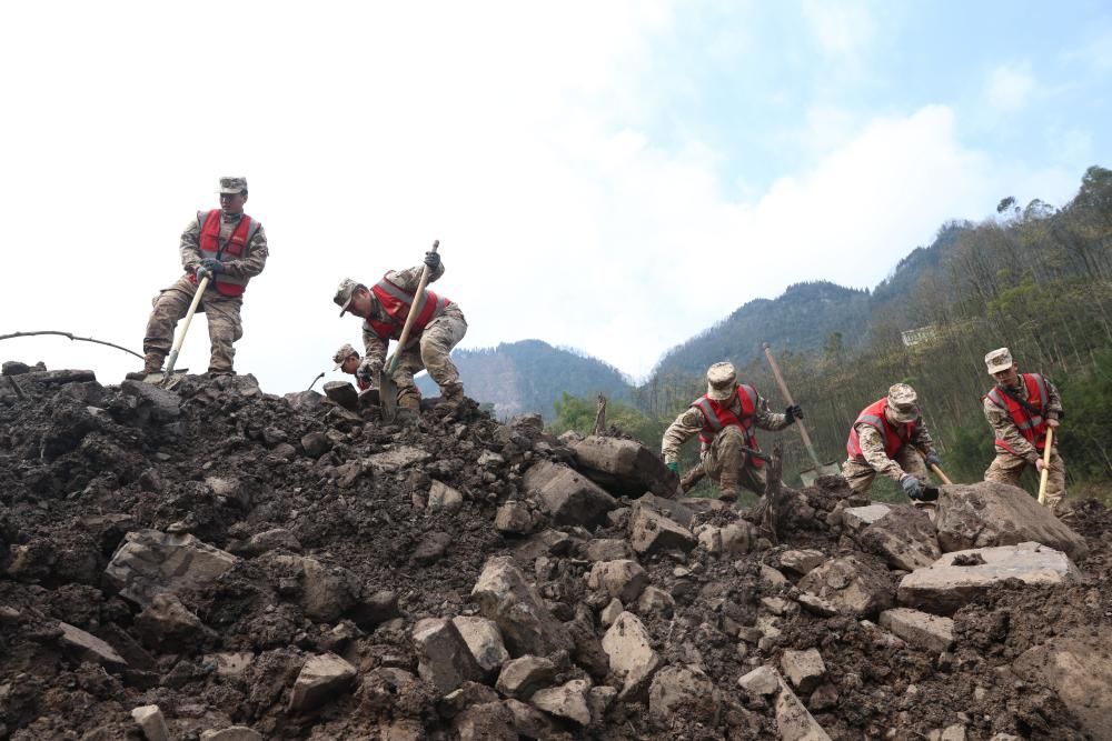 2月10日,武警官兵在筠连县山体滑坡现场搜救。新华社发(郑磊 摄)
