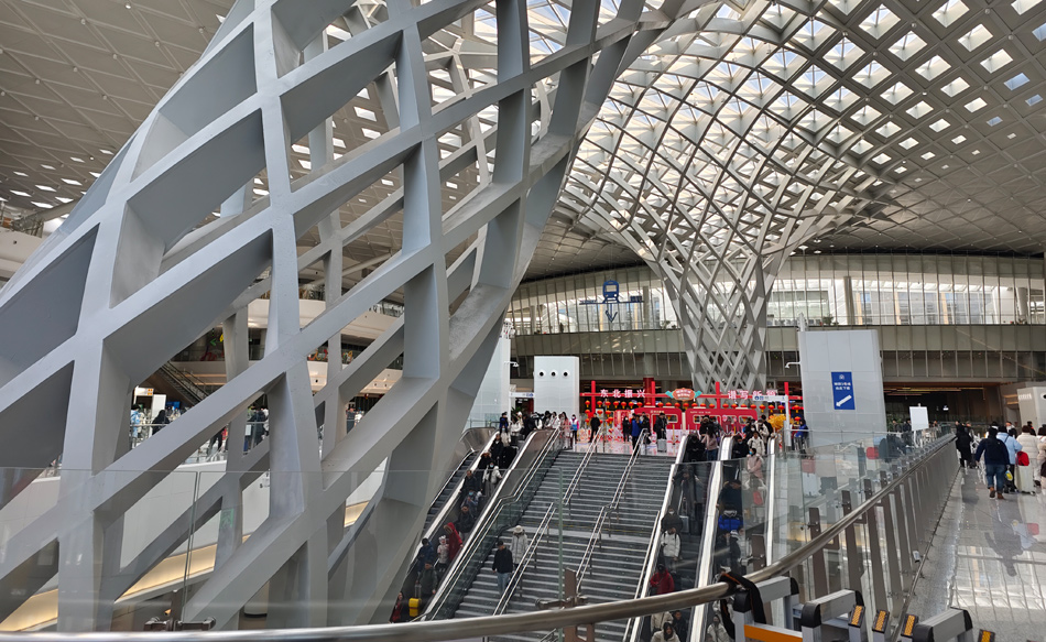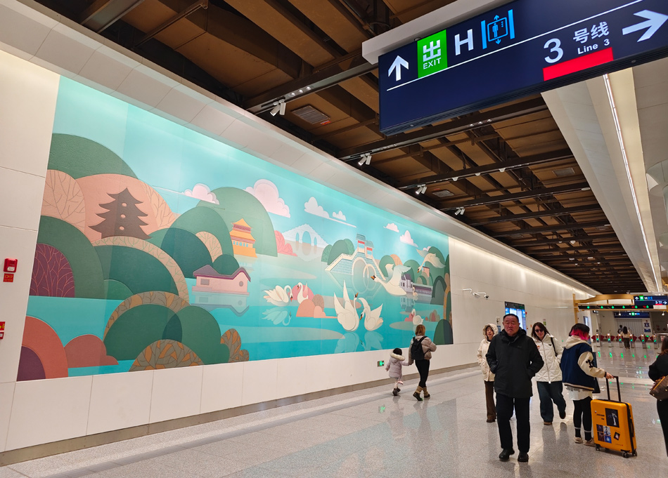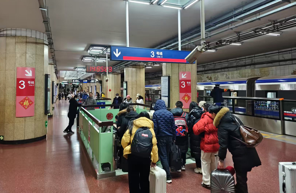 这是北京朝阳站交通枢纽内部,乘客去往北京地铁3号线。春运期间,北京地铁3号线朝阳站的客流相比其他站点明显处于高位。地铁开通运营并与铁路列车实现一站式换乘,为在铁路朝阳站进出京的旅客提供了极大便利。新华网 穆淼 摄