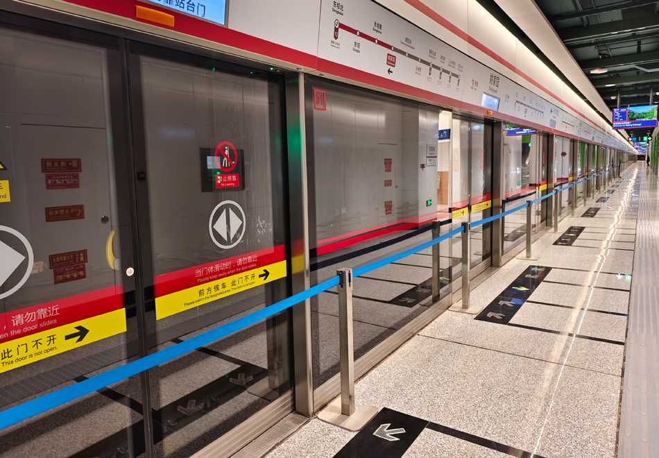 在北京地铁3号线站台,两侧若干站台门常态化不开放,标识信息引导乘客到站台中部开放的站台门前候车。工作人员介绍,北京地铁3号线采用的是4编组车辆和8编组车辆混跑,以灵活应对客流潮汐。运行初期多采用4编组车辆,车身总长比站台短了不少,因而两侧站台门不开放。新华网 穆淼 摄