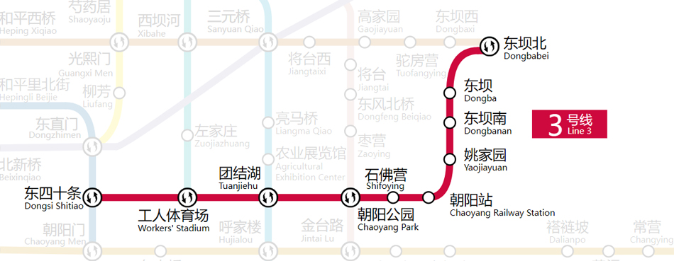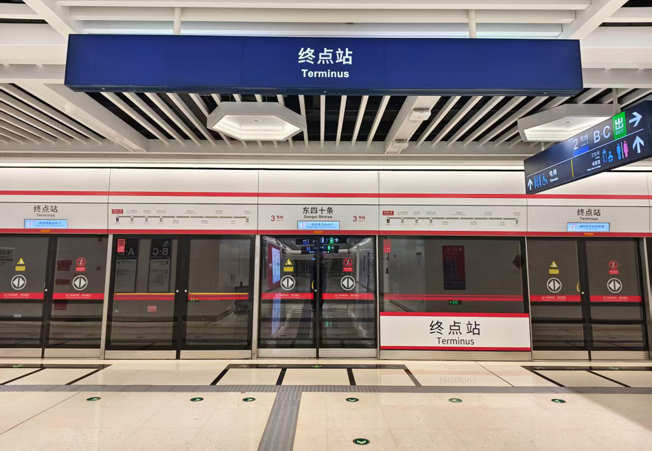 北京地铁3号线一期西段西起东四十条站,东至东坝北站,全长14.7千米,共10座车站。里程虽短,作用却大。其中5座车站与其他地铁线路实现换乘,在朝阳站通过配套交通枢纽与铁路客运无缝对接,既丰富了沿线居民出行选择,减轻原有的地铁6号线、10号线、14号线等线路客流压力,也为完善四通八达的北京城市交通网画上了点睛一笔。