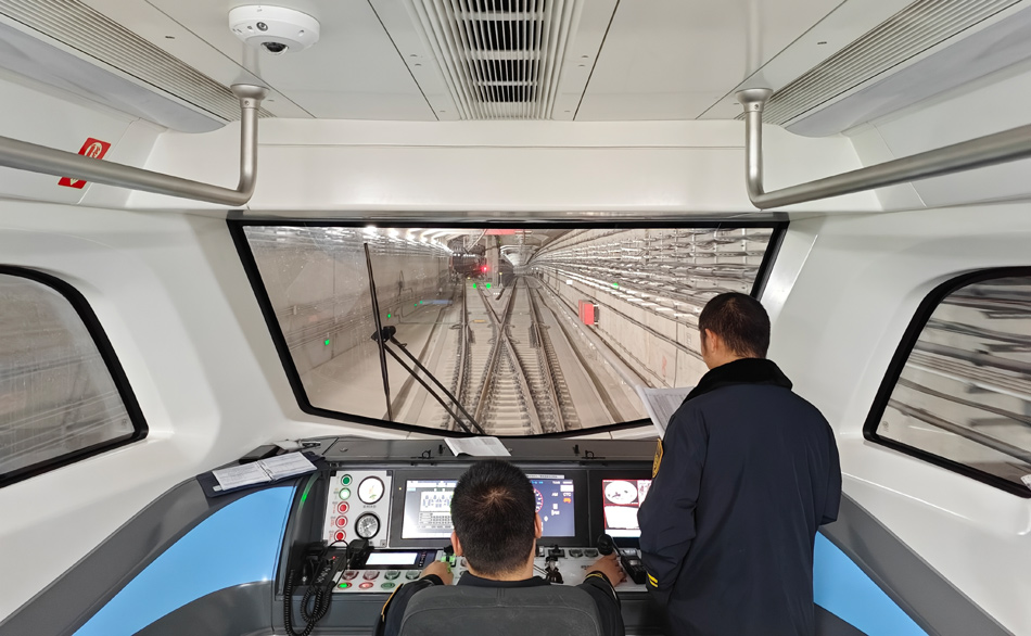 这是北京地铁3号线工作人员在列车驾驶室作业。该线路列车驾驶室采用半开放式设计,从紧邻的车厢前部可清晰看到驾驶室内景和前方隧道。新华网 穆淼 摄