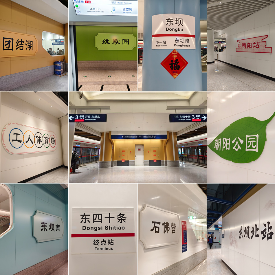 这是北京地铁3号线一期西段各站点内部的标识(拼版照片)。新华网 穆淼 摄