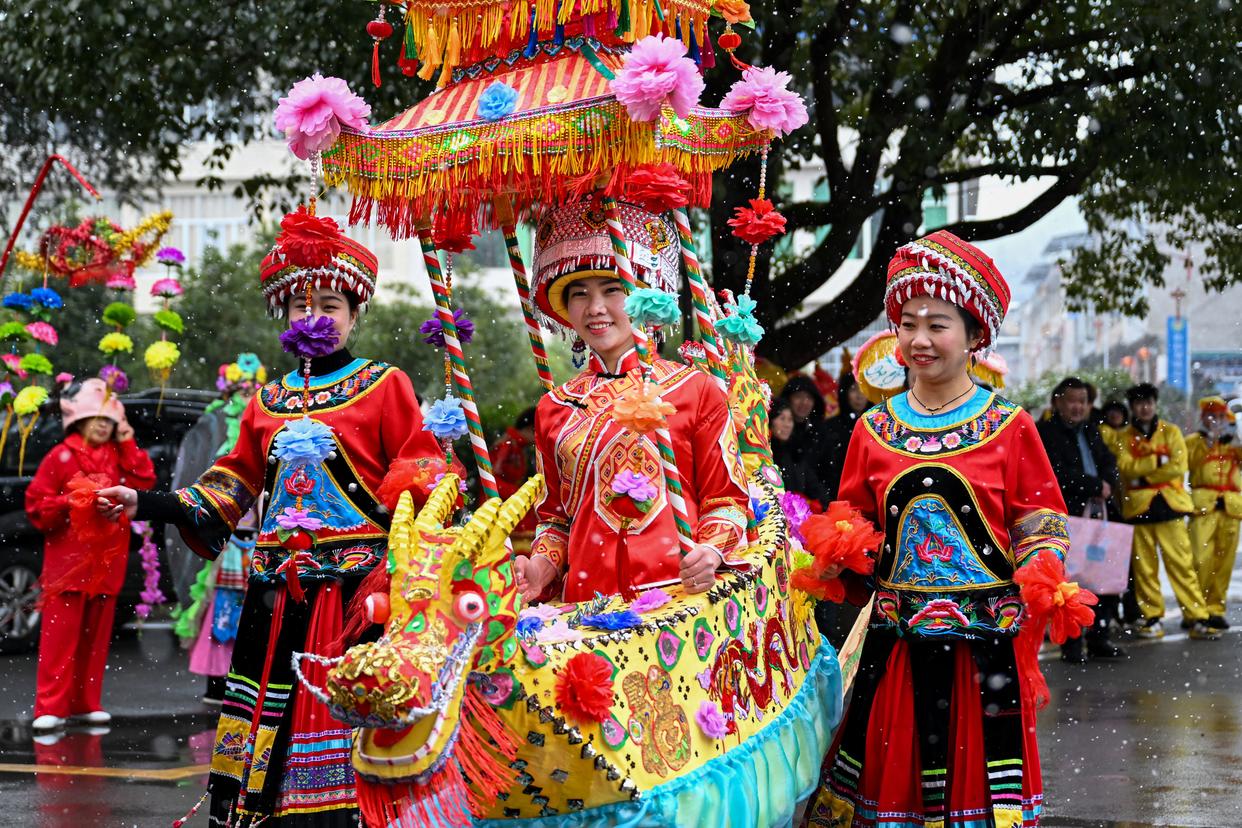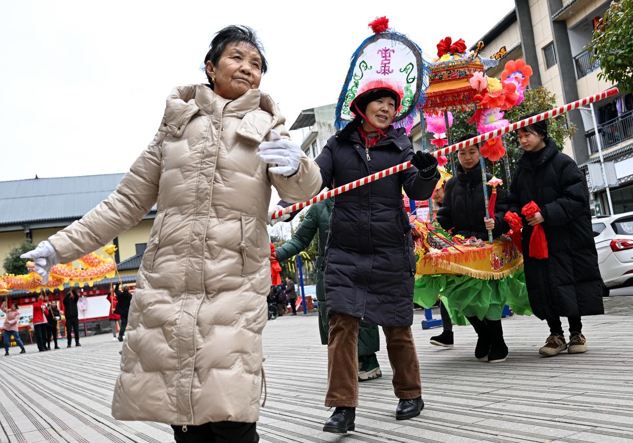 2月6日,在湖北省恩施州利川市柏杨坝镇,灯歌队在街头巡游表演。新华社记者 杜子璇 摄