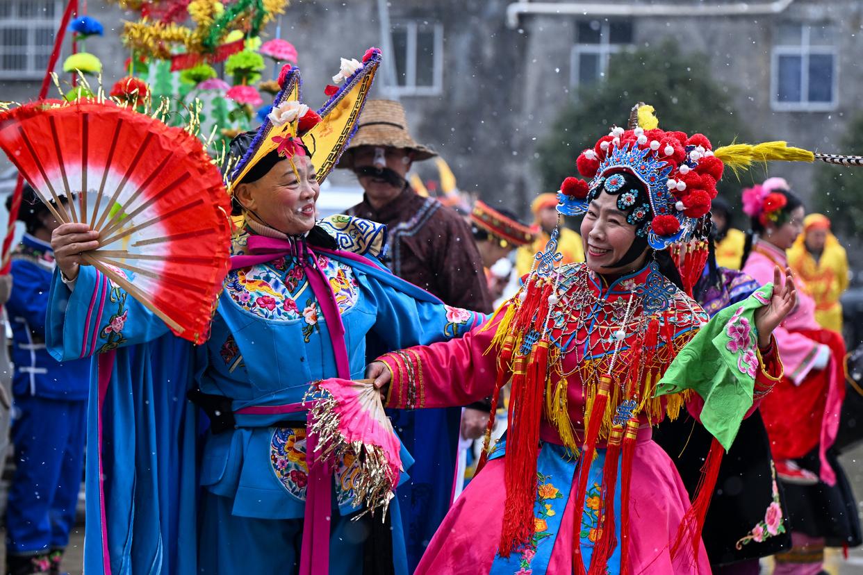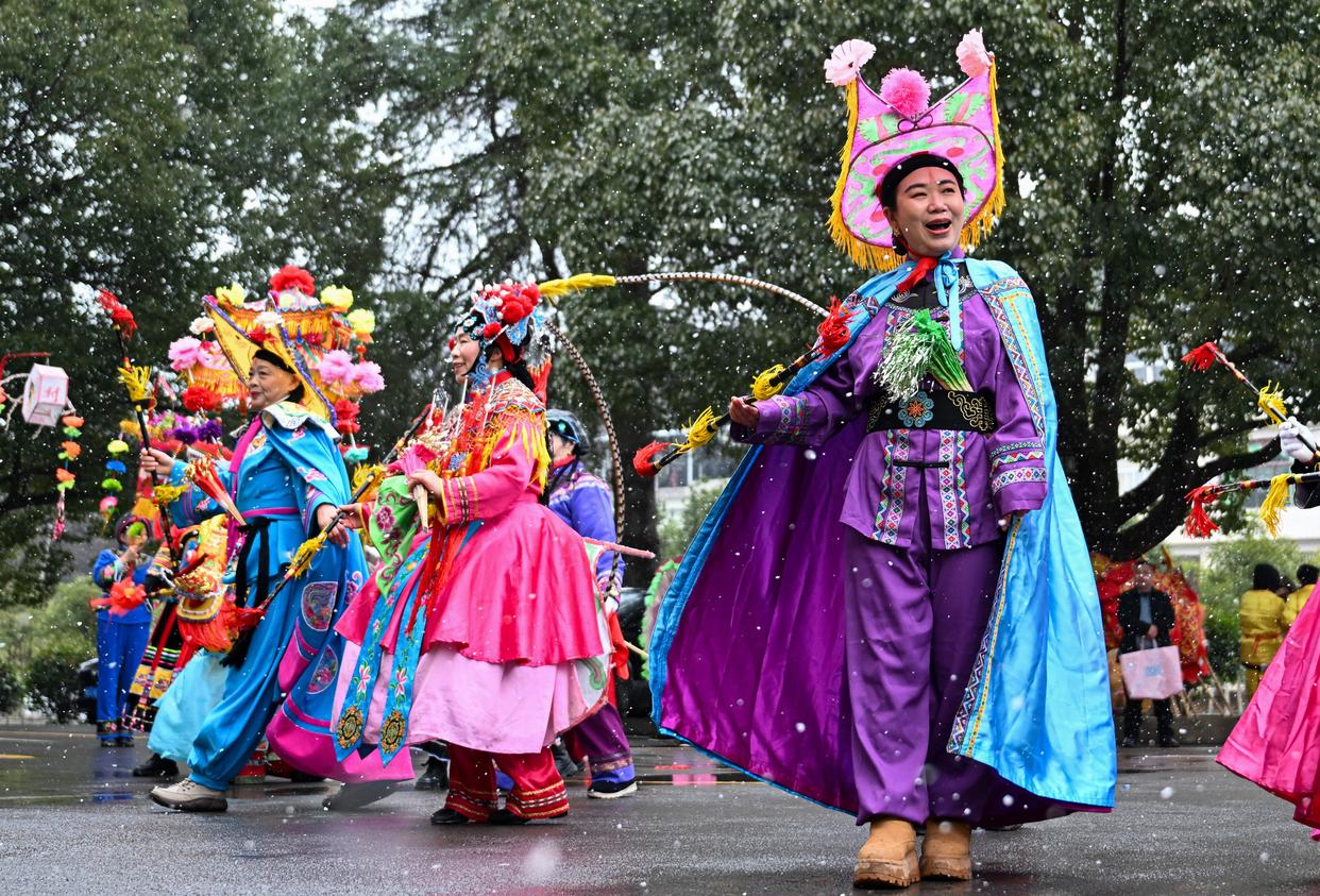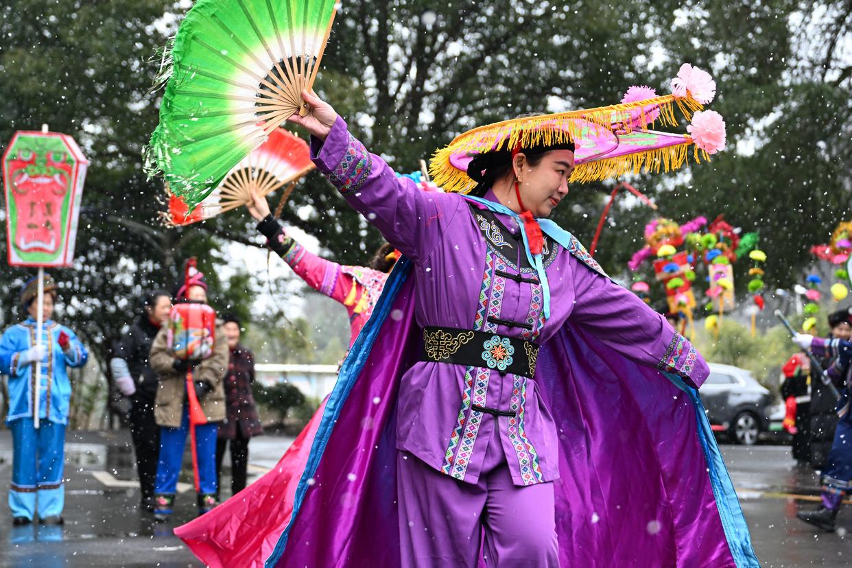 2月6日,在湖北省恩施州利川市柏杨坝镇,灯歌队在表演灯歌。新华社记者 杜子璇 摄