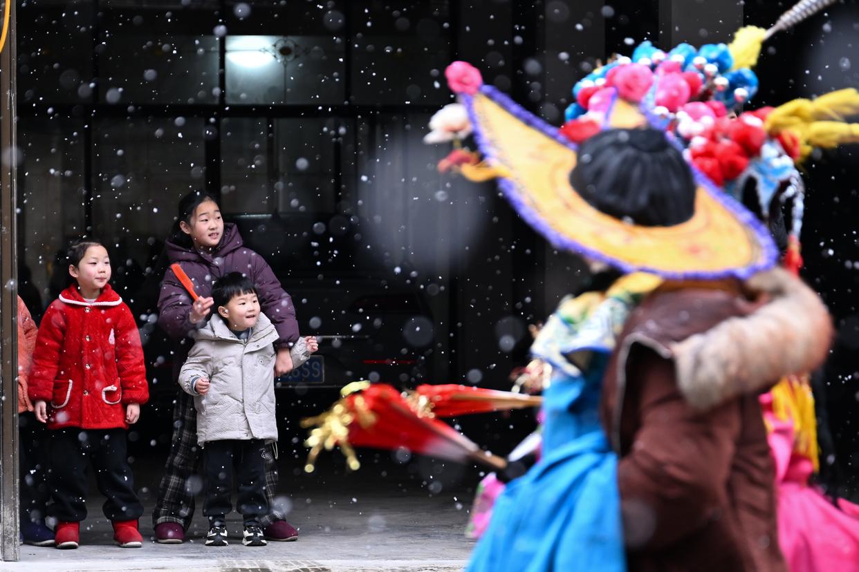 2月6日,在湖北省恩施州利川市柏杨坝镇,人们在街边观看灯歌表演。新华社记者 杜子璇 摄