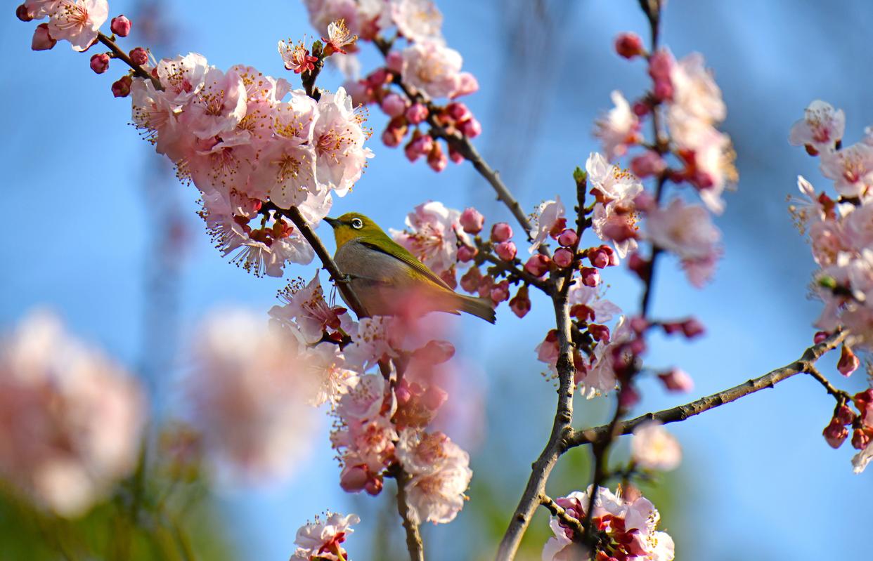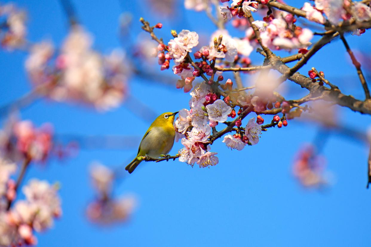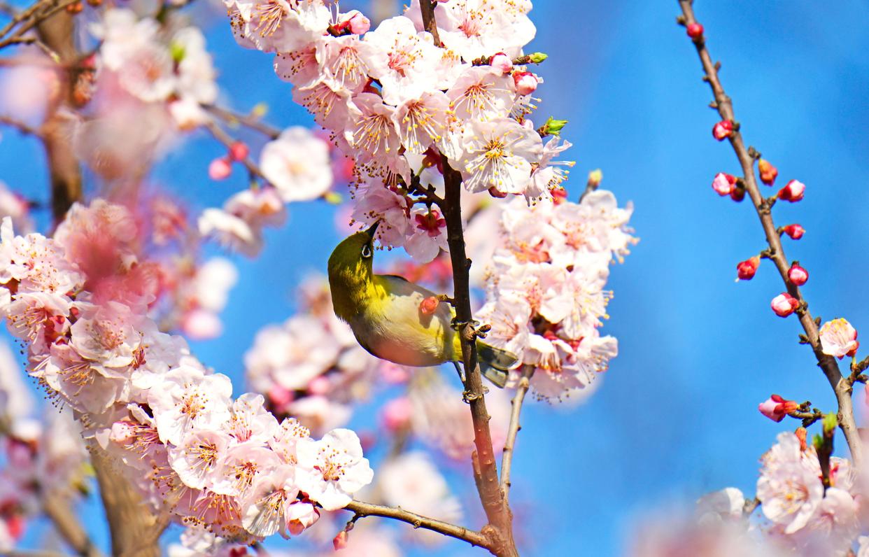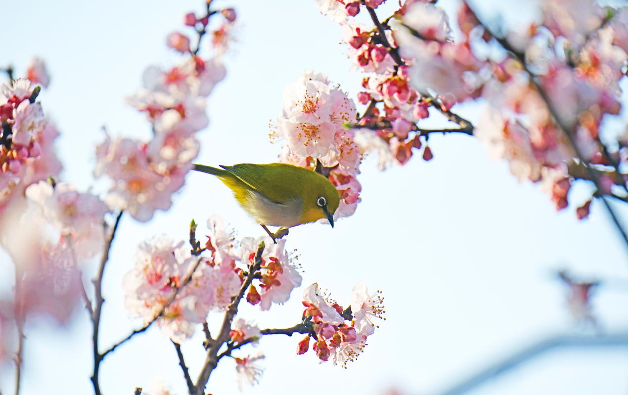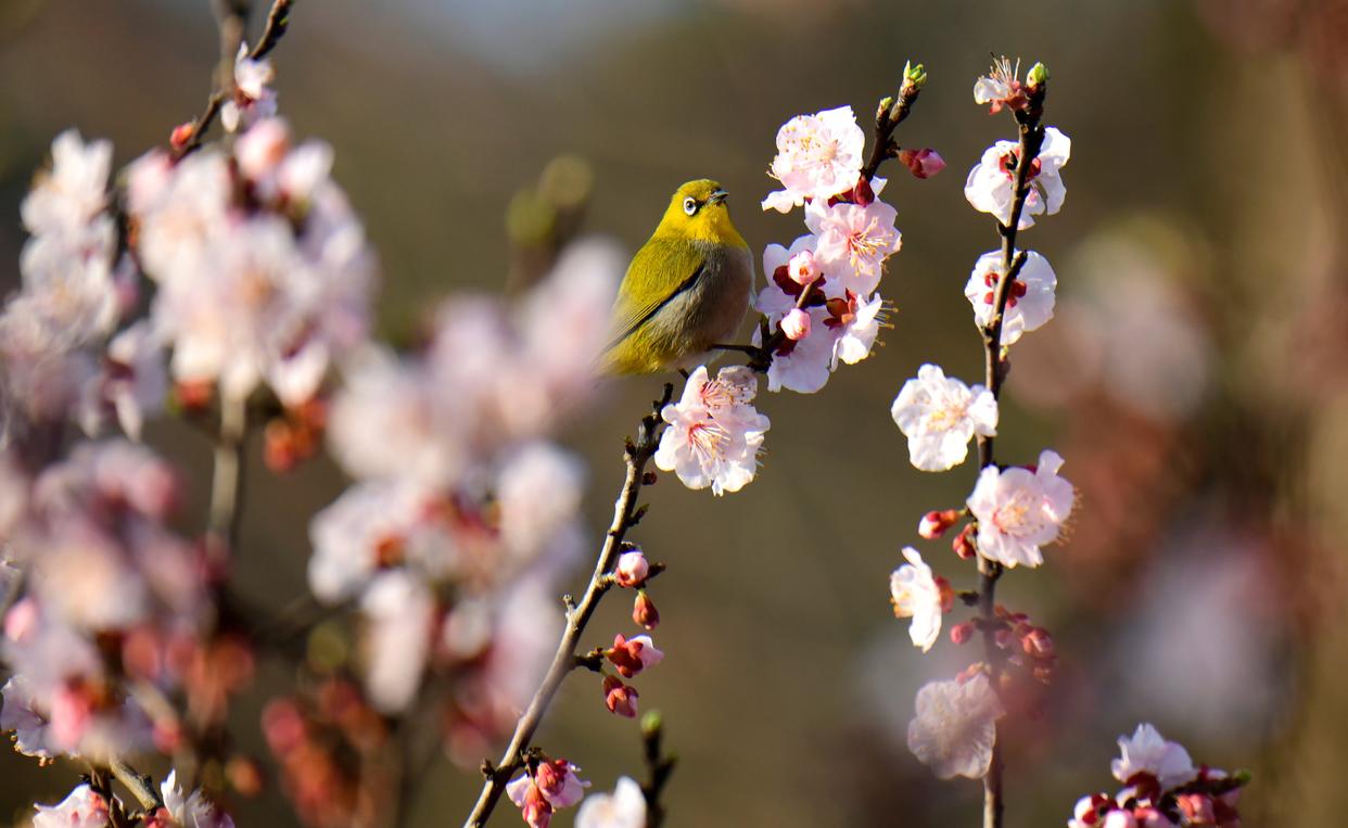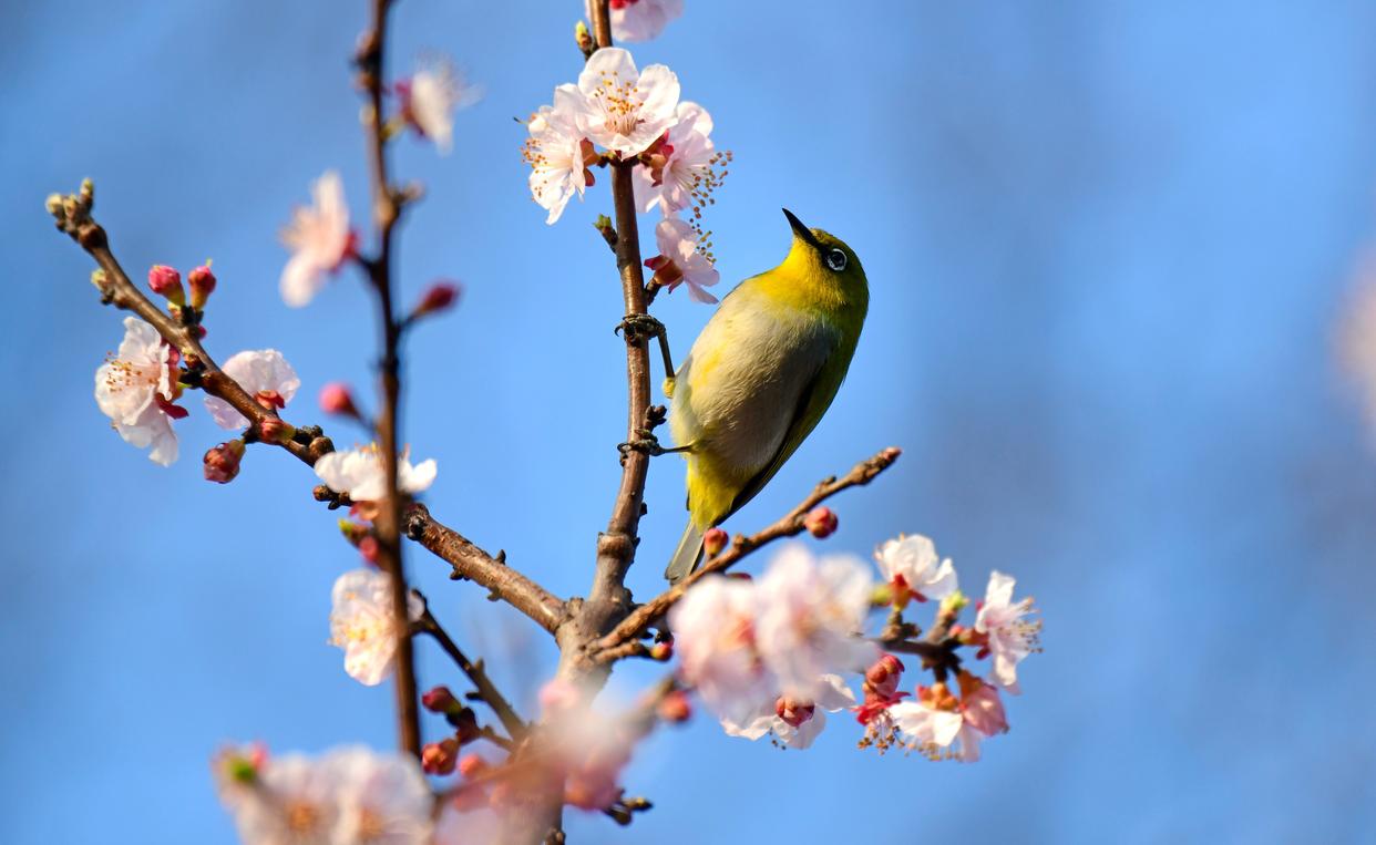 2025年2月11日,云南省红河哈尼族彝族自治州弥勒市,杏花竞相绽放,绣眼鸟在花间觅食、小憩,呈现出一派春意盎然、生机勃勃的景象。