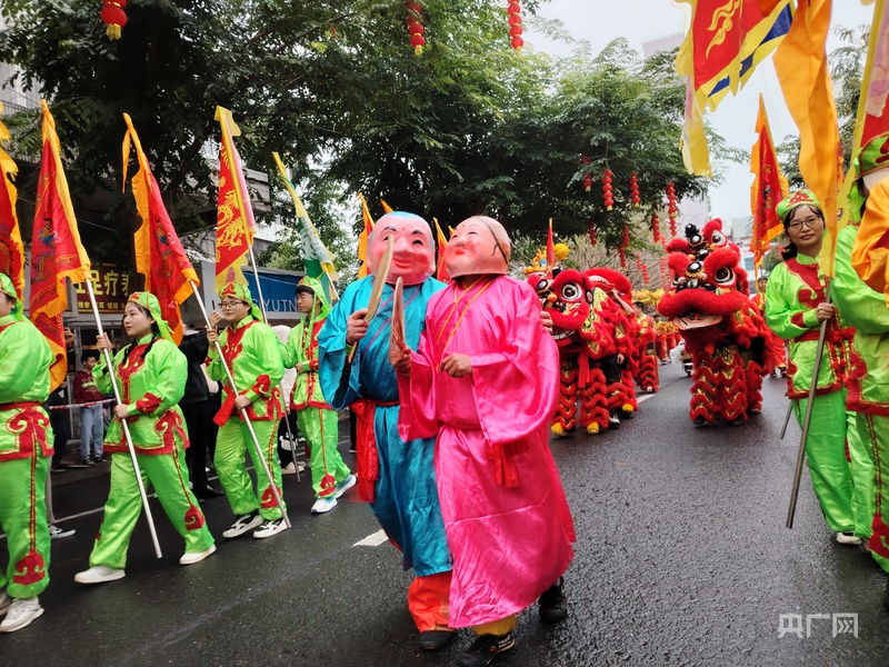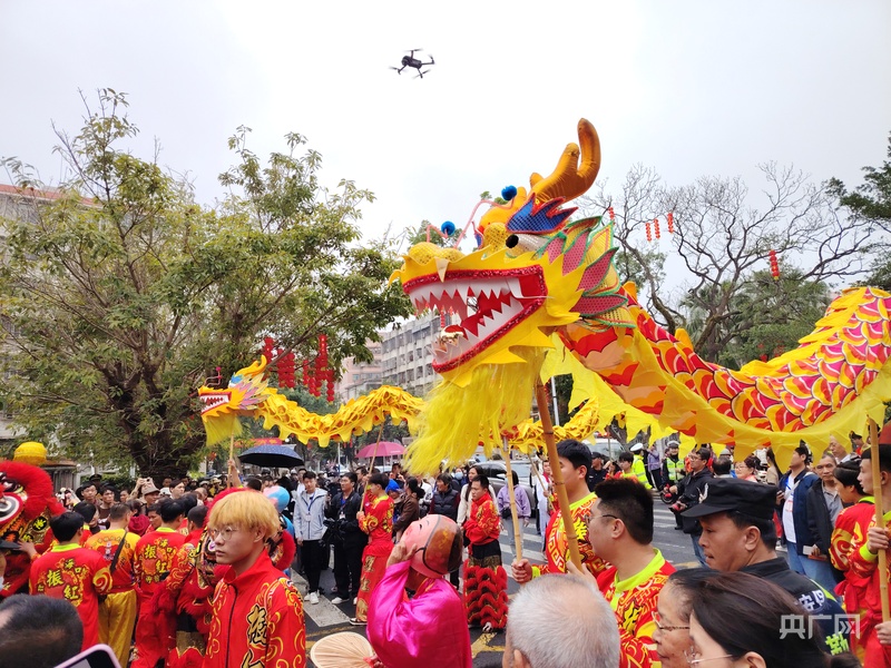 14时许,“装马匹”巡游活动在龙狮欢腾中开启,彩龙在鼓乐伴奏下盘旋腾飞,醒狮跳转、翻跃,动作威猛又显俏皮。精彩的节目开场引得现场观众阵阵喝彩,大家争相拿出手机、照相机记录美好时刻。