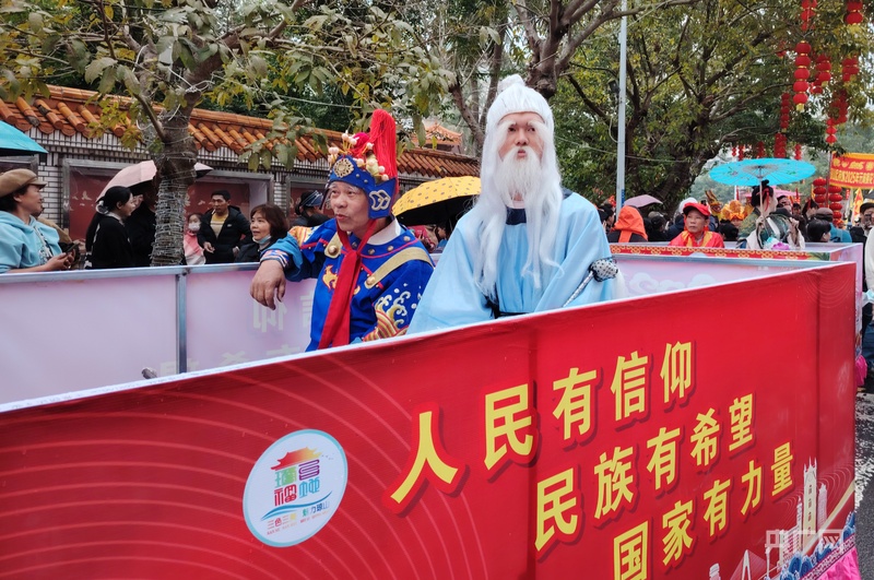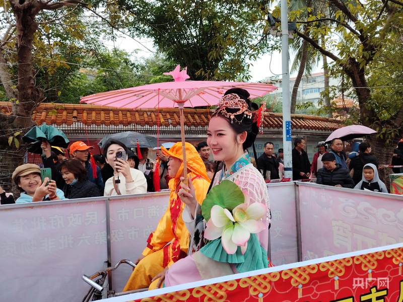沿街远望,“装马匹”巡游队伍已开始浩浩荡荡前行。民众装扮的海瑞、丘濬等海南历史文化名人,他们身着古装,神情庄重,仿佛从历史中走来。这些扮演者乘坐着装饰精美的花车,缓缓行驶在巡游队伍中,纷纷向两旁的市民游客拱手拜年,送上诚挚的祝福,传递着节日的温暖与欢乐。
