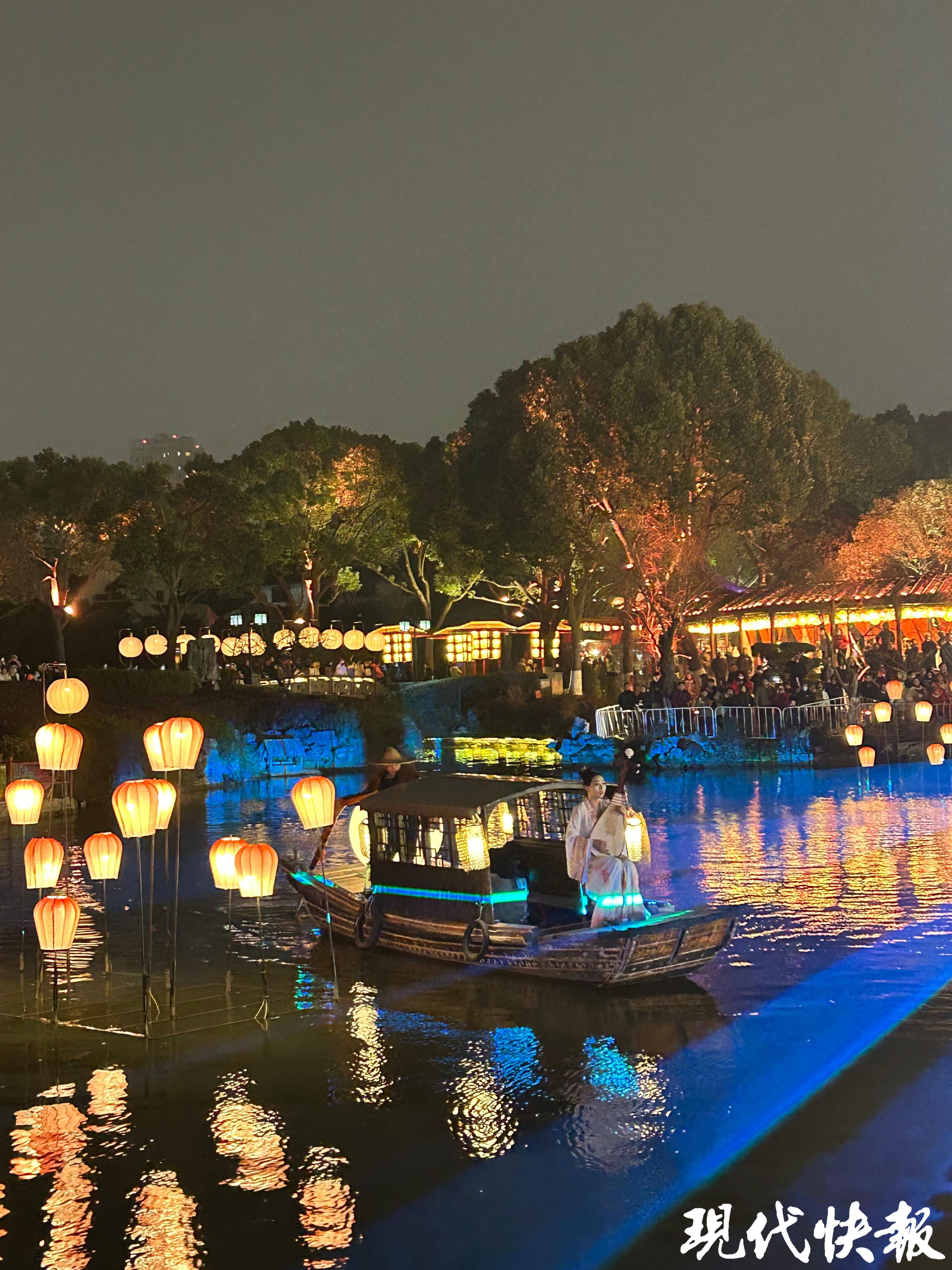 朦胧的夜色中,只见一位船夫划着小船缓缓出现在湖中央,船上端坐着一名江南女子,摇橹芳菲中,琵琶声声流淌,评弹婉转细腻,让人沉醉其中。