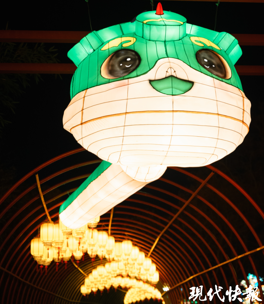 今年是蛇年,盐镇水街“萌蛇”花灯也是颇为引人注目,只见它头戴时尚耳机,仿佛跟随动感的旋律翩翩起舞,将元宵佳节的欢快气氛传递给五湖四海的游客。
