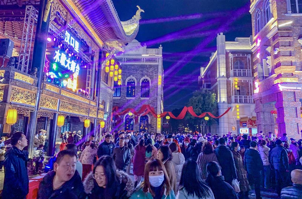 当晚,园博园汉口里也是人如潮流,今年春节,央视春晚武汉分会场武汉园博园汉口里长桌宴、国风舞台等以春晚拍摄地为主的“跟着春晚游武汉”旅游景点火爆,吸引众多游客。