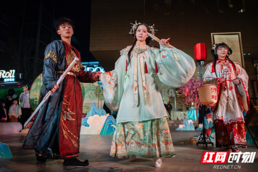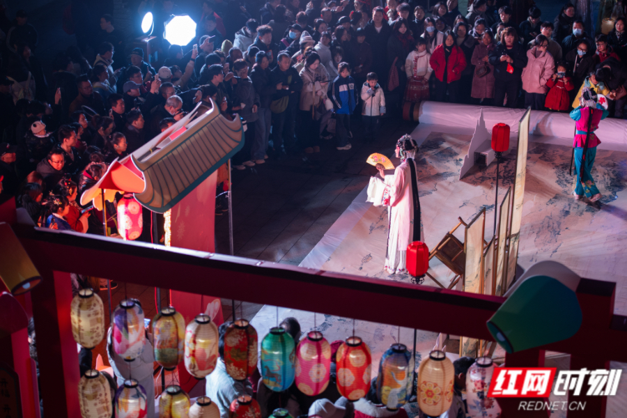在0731建筑前,不倒翁杂技表演者身着传统服饰,以高难度动作赢得阵阵喝彩;中心广场上,演员们身着新中式服装上演“贯灯会”,湘剧演员们带来湘剧表演《游园》,再现古时佳节盛景;楠木厅内,悠扬的古典乐器演奏为活动平添几分雅趣,现场还设置了奖品兑换区,让参与活动的市民游客将喜悦和祝福带回家。