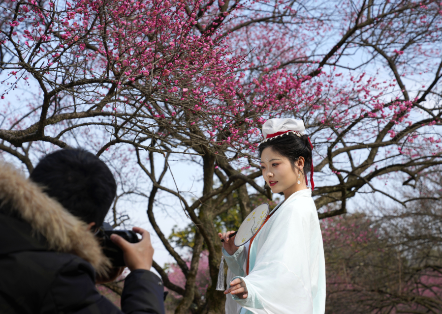 2月16日,一名女子身着古装在杭州植物园灵峰景区梅树前拍照留影。