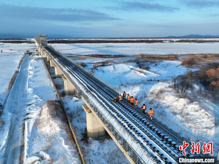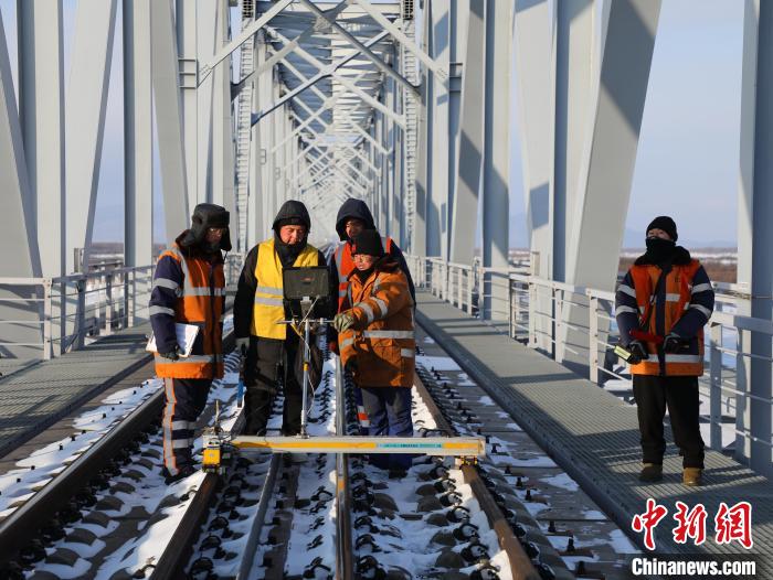 “这座大桥是四线套轨,既有俄罗斯1520毫米的宽轨,又有咱中国1435毫米的标轨,我们都叫它‘骑马线’。”2月17日,中国铁路哈尔滨集团公司佳木斯工务段同江线路车间技术员万广峰提高了嗓门与身边的工友们交流着,好让声音盖过呼啸的风声。工友们一边呵着白气,一边聚精会神地听着,时不时点头。凛冽的寒风如刀子般刮过,这群年轻的工友站在大桥上。
