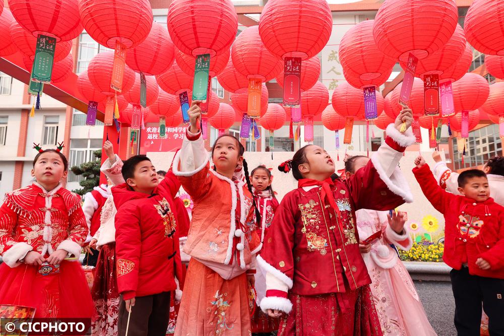 ↑2025年2月12日,在江苏省无锡市滨湖区东绛第二实验学校,学生在猜谜打卡。CICPHOTO/高月鹏 摄
