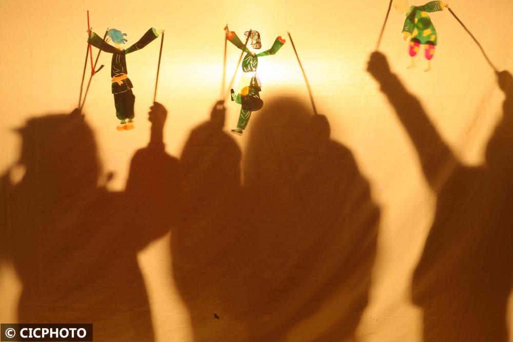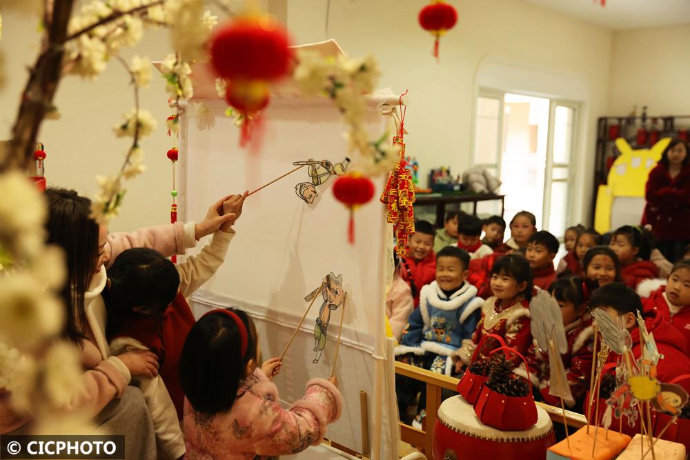 ↑2025年2月14日,在浙江省湖州市德清县乾元镇第一幼儿园,小朋友在老师指导下表演皮影戏。CICPHOTO/倪立芳 摄