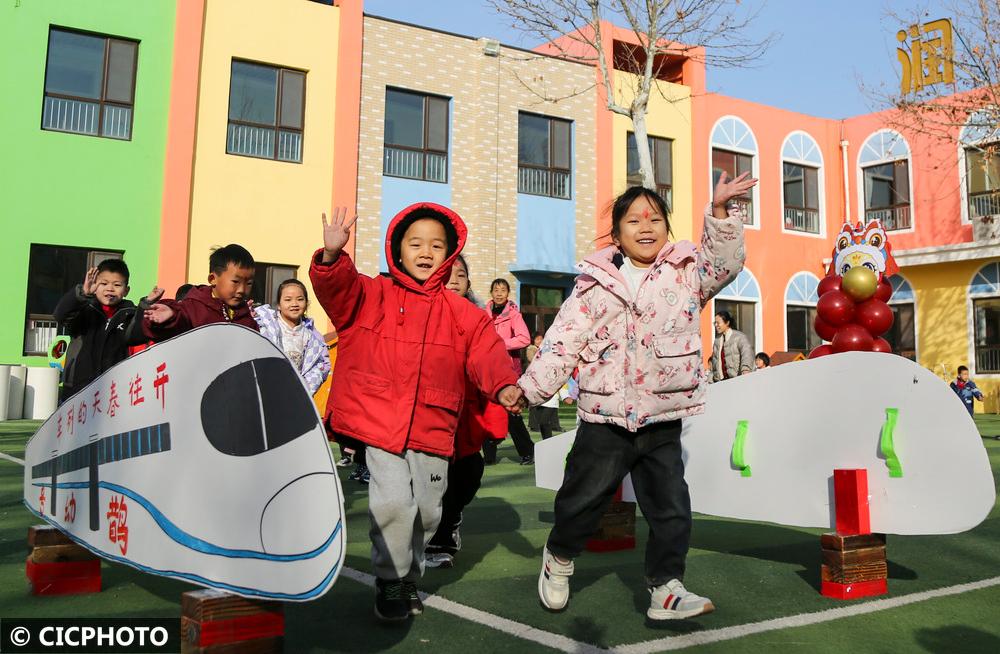 ↑2025年2月14日,在山东省东营市广饶县李鹊镇中心幼儿园,学生步入校园。CICPHOTO/刘云杰 摄