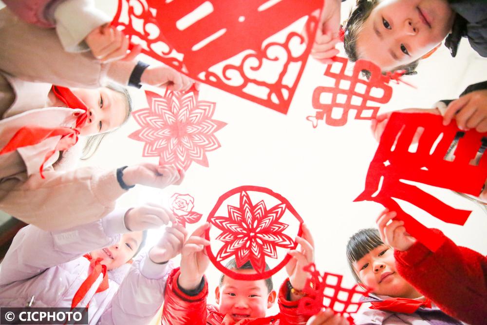 ↑2025年2月13日,在江苏省如皋市如城街道如城小学剪纸工坊,学生在“开学第一课”上展示创作的剪纸作品。CICPHOTO/徐慧 摄