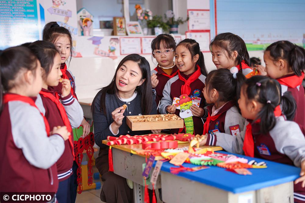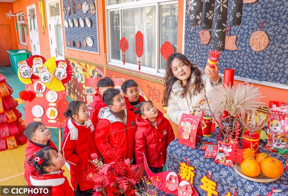 ↑2025年2月13日,在江苏省扬州市江都区育才幼儿园,老师在向小朋友讲解和春节相关的知识。CICPHOTO/任飞 摄